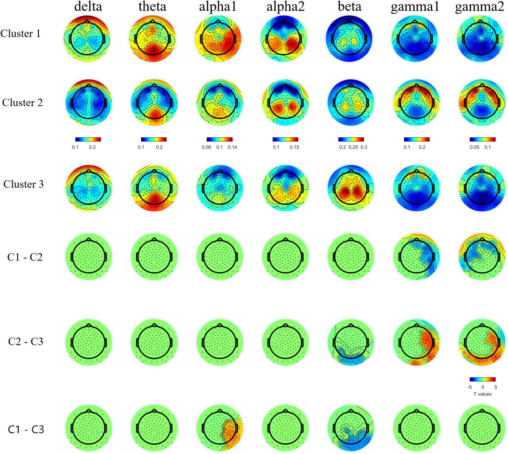 Topographic plots of group averaged relative band power in bands and topographical plots of T values from band specific pairwise group comparisons. Cluster-based permutation test detected lower relative gamma1 and gamm2 bands powers in C1 and C3 than C2, lower relative beta band power in C1 and C2 than C3, and higher relative alpha1 band power in C1 than C3. For multiple comparison cross bands, one directional family-wise alpha level was set at 0.05.