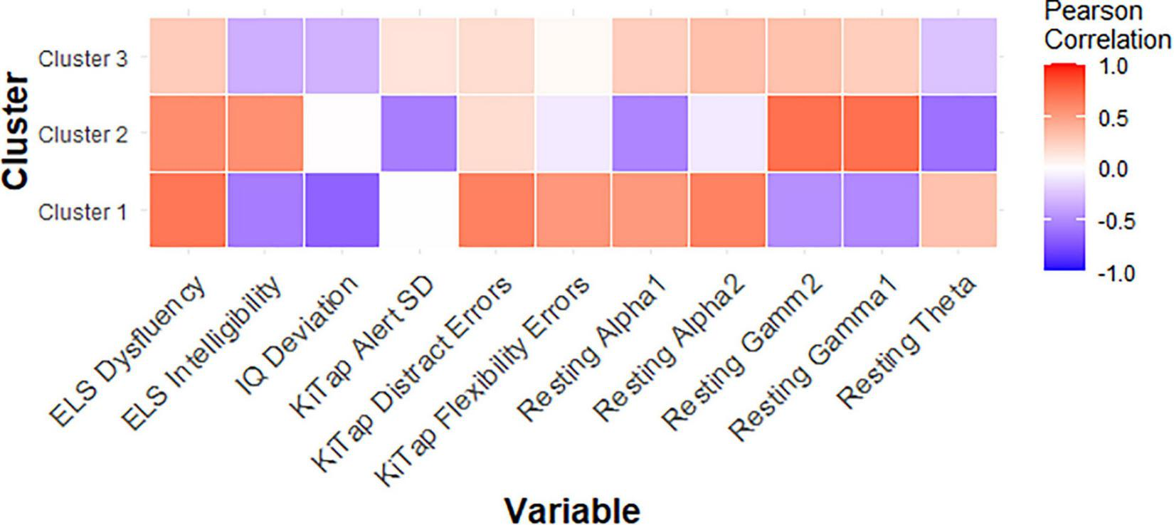 We found a three cluster solution with maximum distance between the different clusters confirmed by F-tests (Table 3 and Figure 1). Cluster 1 is primarily defined by elevated psychiatric symptoms, including depression and anxiety, with relatively typical electrophysiological features (n = 11, 27% of PMC sample). Cluster 2 is primarily defined by impaired cognitive processing in the form of executive dysfunction as well as elevated high frequency resting gamma power (n = 13, 32%). Cluster 3 represents a relatively unaffected group with minimal abnormalities across neuropsychiatric features (n = 17, 41%). Power band comparisons by clusters are available in Figure 2, and further detailed in Supplementary Figures 1–3.