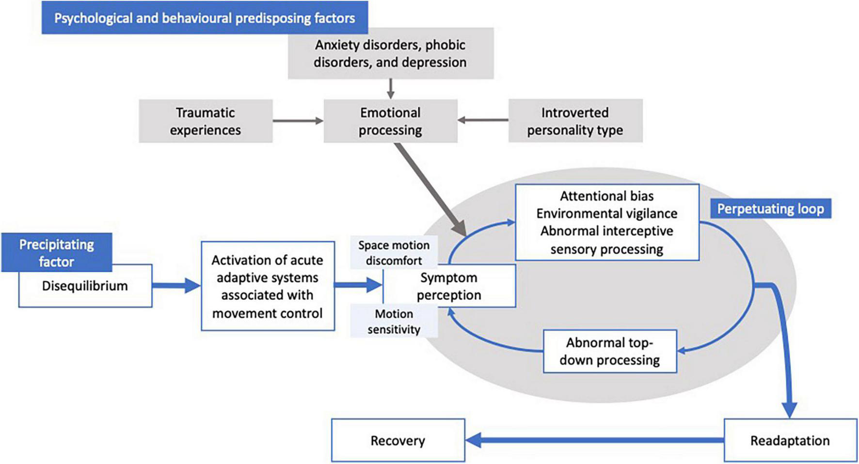 Graphical depiction of the mechanisms suggested to be involved in functional dizziness. That is, a participating factor (i.e., vestibular loss, medical cause, and anxiety) causes disequilibrium, leading to a transient distortion of vestibular perception impairing cognitive control of movement and balance. Psychological factors and behavioral co-morbidities (i.e., anxiety, phobia, emotional trauma, and personality types) are suggested to increase the likelihood of the transient perceptual distortions to persist, resulting in a perpetuating loop causing a failure of re-adaptation.
