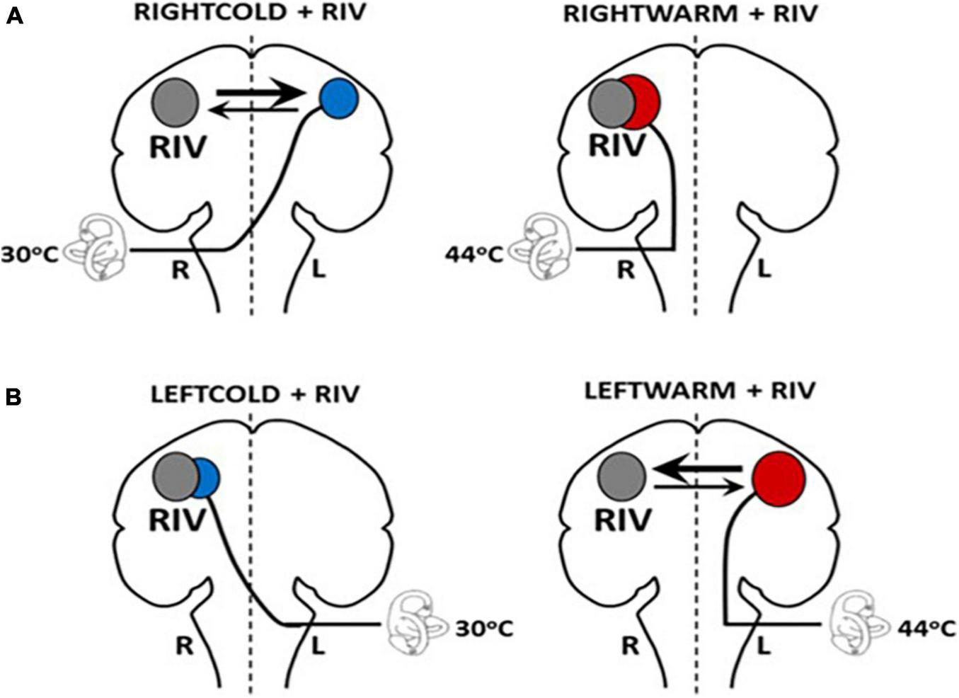 Schematic model illustrating hemispheric activation during CALORIC + RIV stimulation: perceptual switching during binocular rivalry activates the right hemisphere (gray circle). Hemispheric activations following caloric stimulation are shown by the red circle following warm irrigations or by blue circles following cold irrigations. The labyrinth represents the side of the caloric irrigation. The size of the circles illustrates the relative degree of the activation. (A) During RIGHTCOLD + RIV, the hemispheres are in conflict; however, the right hemisphere exerts a predominant effect (as shown by the relative thickness of the arrows). No interhemispheric conflict occurs during either RIGHTWARM + RIV as both stimuli activate the right hemisphere. (B) Similarly, no conflict is present in LEFTCOLD + RIV condition, whereas during the LEFTWARM + RIV condition, conflict presents, but critically here the left hemisphere exerts a greater influence.