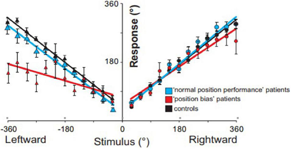 Position task results: grouped response–stimulus position performances are shown for patients with a position bias (red; ‘patients), patients with normal performance (blue; control patients), and age-matched controls (black line). Position bias was calculated for each stroke patient from the subjective response–stimulus position performance regressions, by dividing the leftward regression slope by the rightward regression slope. Vertical bars represent standard errors of the mean.