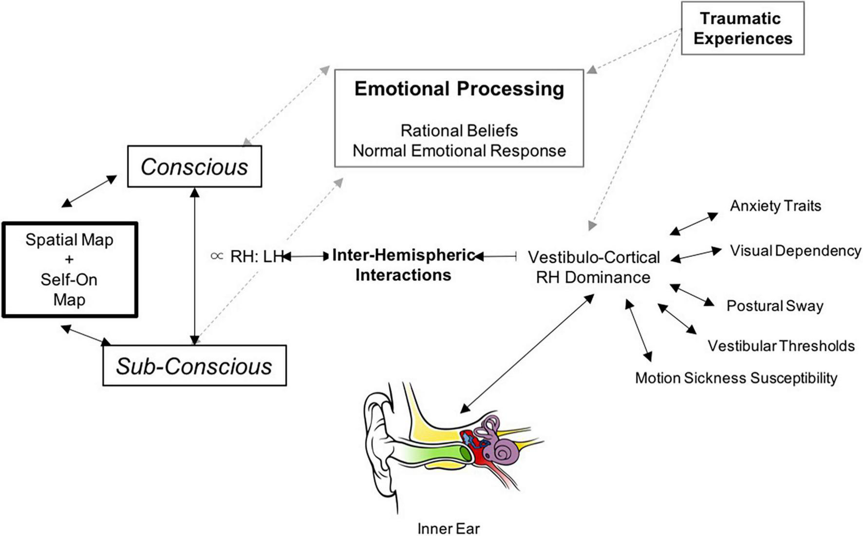 Schematic illustration of our proposed neurobiological model for PPPD: The central component in the model is the interhemispheric interactions in the vestibulo-cortical network that determines its dominance and in-turn influences risk factors for developing PPPD including lower motion perceptual thresholds, increased sway during postural control, increased motion sickness susceptibility, higher visual dependence, and anxiety. These interhemispheric interactions can also be influenced by predisposing emotional trauma (non-vestibular). This cortical network receives signals from bottom-up vestibular transformations provided by the vestibular system. The net result of the cortical system is to generate perceptual vestibulo-spatial and vestibulo-temporal maps of the world, and this is cross-referenced with physical signals from the accelerometers (balance organ) in our inner ear. If there is a mismatch as in the case of PPPD – this subsequently opens up feed-forward pathways to emotional networks.
