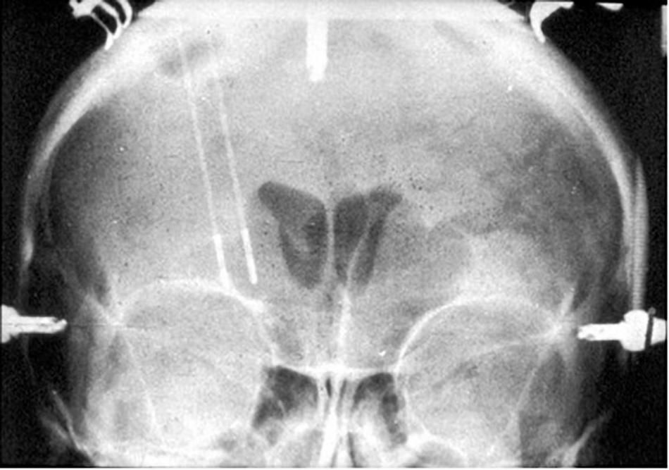 Coronal X-ray of electrodes in place for creation of Leksell’s right frontal capsulotomy lesions.