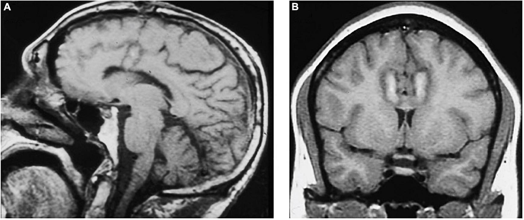 Limbic leucotomy. (A) Sagittal T1-weighted and (B) Axial FLAIR MRI of limbic leucotomy lesions.