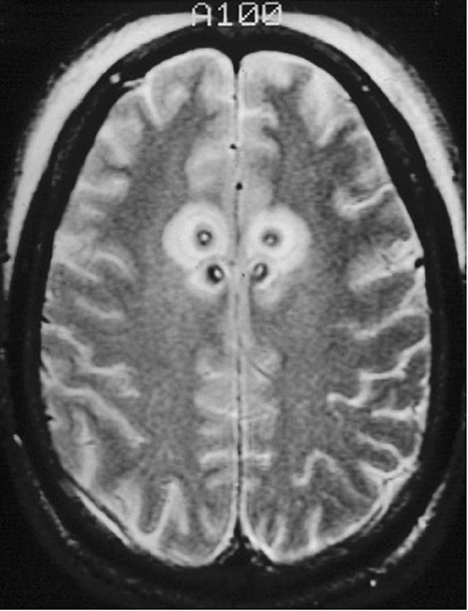 Staged cingulotomy. Transverse T2-weighted MRI of chronic (posterior) and acute (anterior) double cingulotomy lesions.