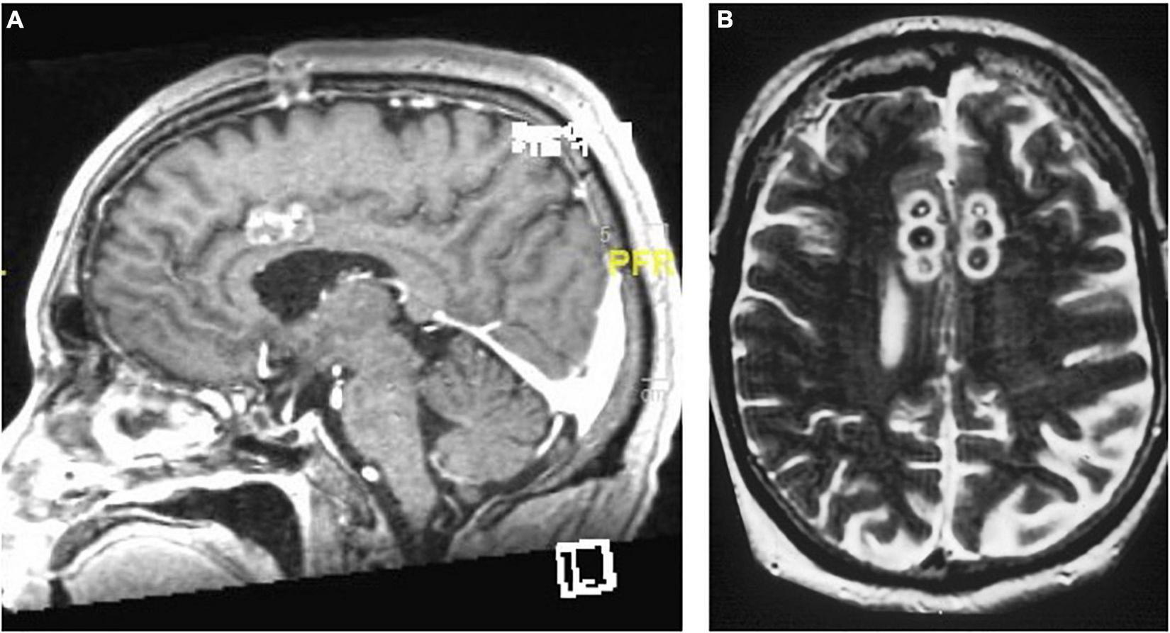 The “six-pack” cingulotomy. (A) Sagittal and (B) Axial T2-weighted MRI of chronic triple lesion cingulotomy.