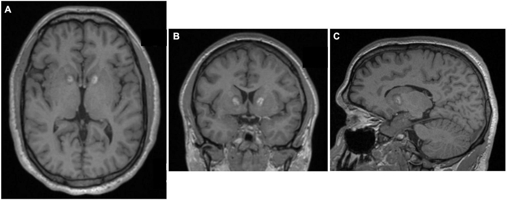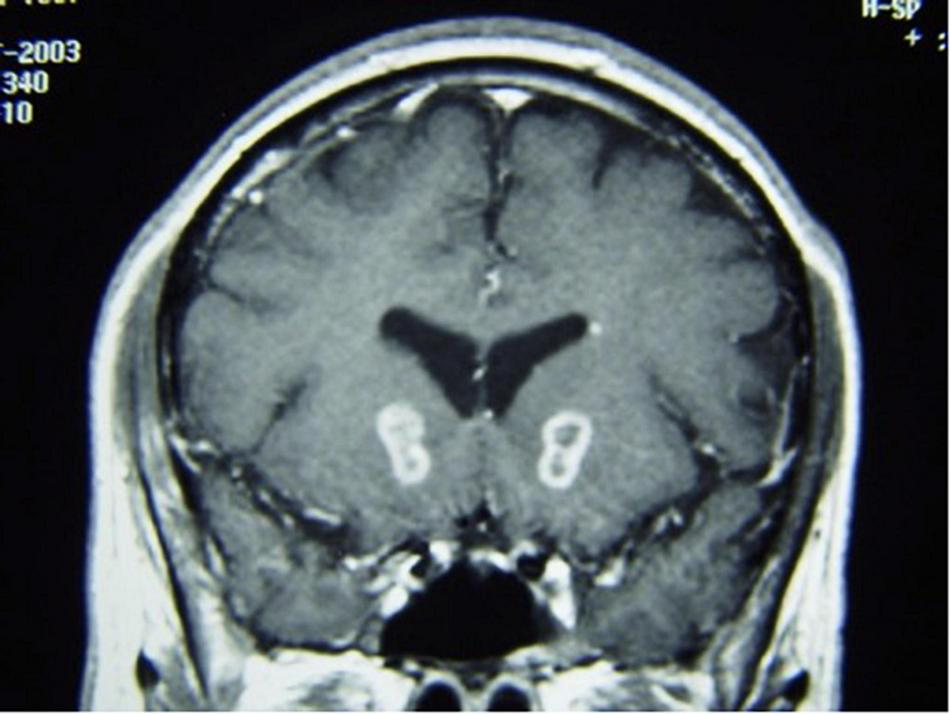 Coronal T1-weighted MRI with contrast of gamma knife capsulotomy lesions.