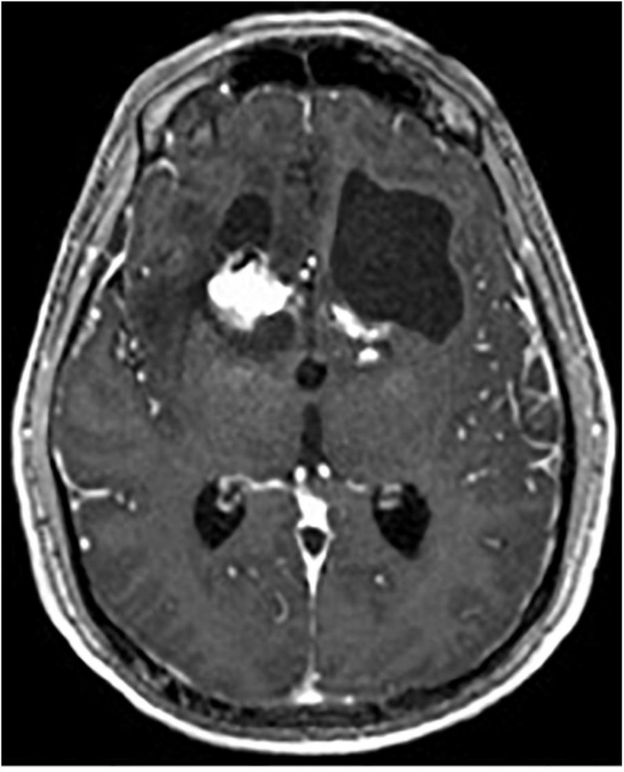Axial T1-weighted MRI with contrast of brain cyst in the left hemisphere after gamma knife capsulotomy.