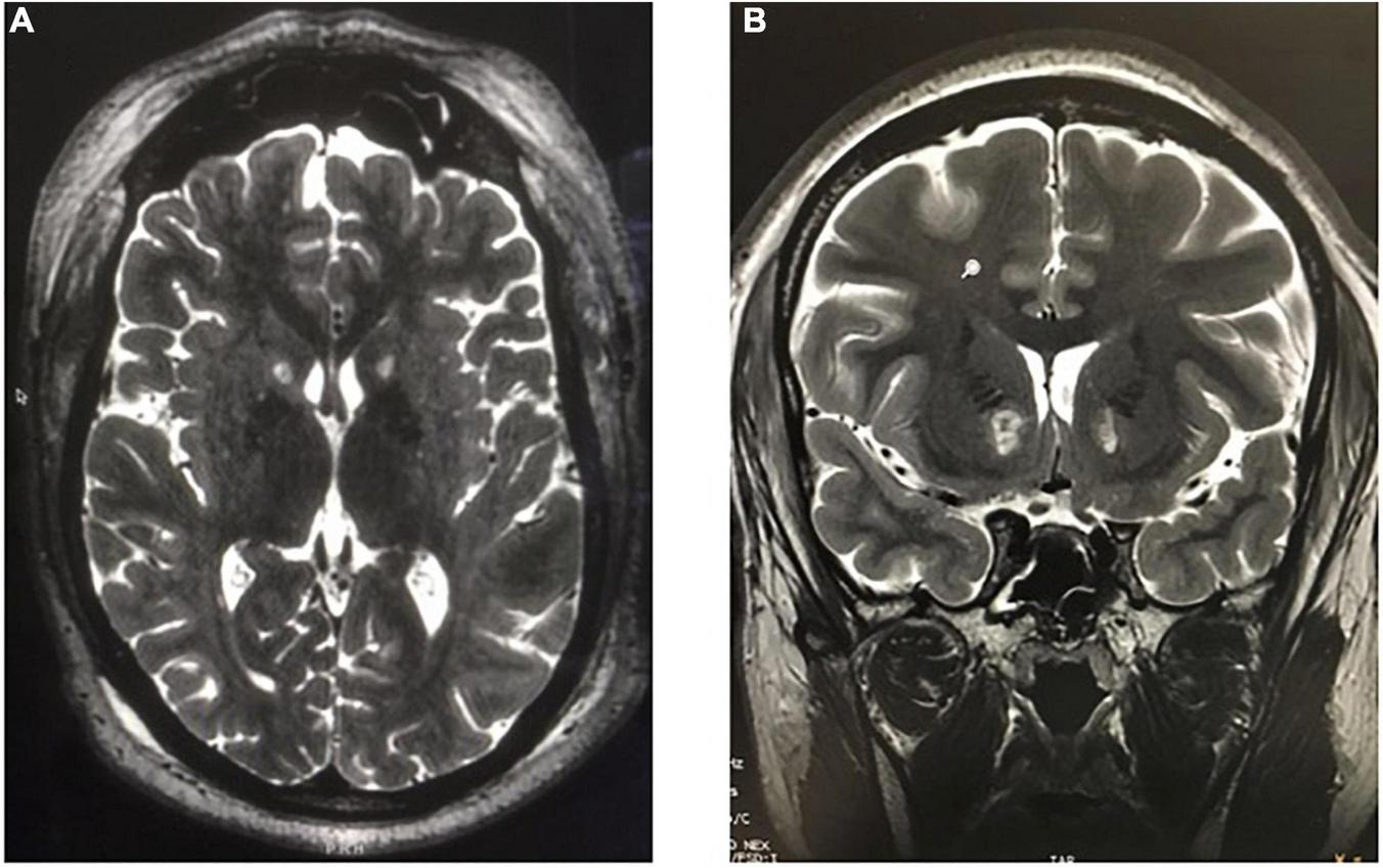 MR-guided focused ultrasound capsulotomies (MRgFUS). (A) Axial T2-weighted and (B) Coronal T2-weighted MRI after bilateral MRgFUS capsulotomy.