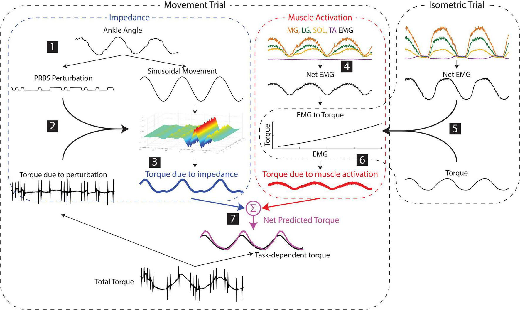 Estimating the contributions of impedance and muscle activation to the net torque about the ankle. (1) Small pseudorandom binary sequence perturbations (PRBS) were superimposed on the larger sinusoidal movement. (2) Ankle impedance was estimated by fitting a time-varying impulse response function between the small perturbation and the resultant torque. (3) The torque due to the impedance was computed by convolving the larger sinusoidal movement with the estimated impedance. (4) The net muscle activity about the ankle was approximated as the difference between the average of the plantarflexor activity and the dorsiflexor activity. (5) The torque due to muscle activation was predicted by a static relationship between the net EMG and ankle torque, estimated from data collected in a separate isometric experiment for each subject. (6) The torque due to muscle activation in the movement trials was computed using this static relationship and the EMGs measured in the movement trial. (7) The net predicted torque was computed as the sum of the torques due to impedance and muscle activation.