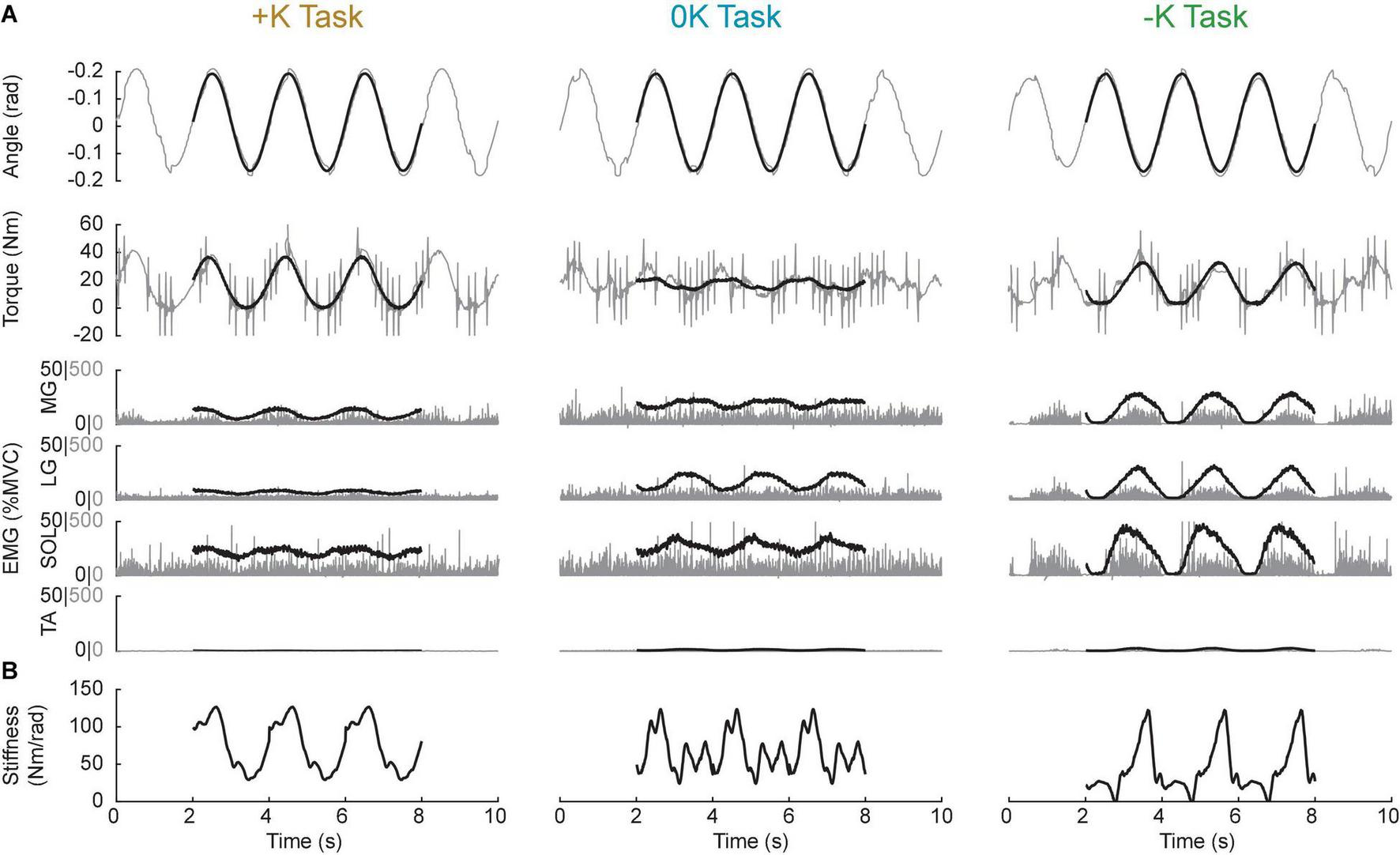 In the +K task when the ankle impedance was consistent with the task demands, subjects produced more torque via ankle impedance and less through muscle activation. While this finding on its own was not too surprising it provided a confirmation of expectations, and a means to quantify how much impedance could help or hinder neural control. In contrast, both other tasks were completed by increasing the torque arising from muscle activation, as neither could be completed using only impedance modulation. This is because the dominant component of impedance in these tasks was stiffness, which is a finite positive value (Hunter and Kearney, 1982) and generates a torque that resists the imposed sinusoidal motion. Generating a constant level of torque (0K task) or a torque that assists the imposed motion (–K task) requires muscle activation to counter the torque due to impedance. Our results agree with this expectation, as there were nearly equivalent torques from impedance and changes in muscle activation in the 0K task and substantially more torque due to muscle activation in the –K task.