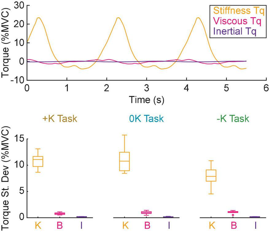 Our estimates of impedance were obtained during cyclical movements, but the use of these estimated to compute the torque due to impedance relied on an important assumption. This was that any changes in torque arising from changes in the set-point or equilibrium position were captured by the muscle activation torque component. The accuracy of our modeled torque, which was not fit to the experimental measures, suggests that any errors in the estimated impedance torque were modest (4.0% MVC). In addition, it is important to note that any errors that did exist would not alter our primary conclusions that the +K task was completed more consistently and perceived as easier to perform, as these primary outcomes were independent of our decomposition technique.