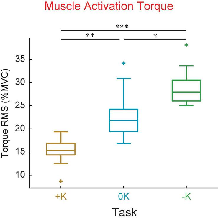 We compared the torque from muscle activation across the three tasks (Figure 7), to confirm our expectation that tasks which aligned with the impedance of the joint would require less muscle activation. We found that the torque due to muscle activation was smallest in the +K task. The torque due to muscle activation, as measured by the root mean square, varied between the different tasks [F(2, 18) = 27, p < 0.0001]. The torque from muscle activation was significantly lower in the +K task compared to the –K task (Δ = 13.9 ± 4.9% MVC, p < 0.0001) and the 0K task (Δ = 7.9 ± 4.9% MVC, p = 0.002). These results confirm our expectation that the +K task resulted in a task which required less torque due to muscle activation, allowing us to link any changes in perceived difficulty and task performance to a decreased reliance on neurally controlled muscle activation.