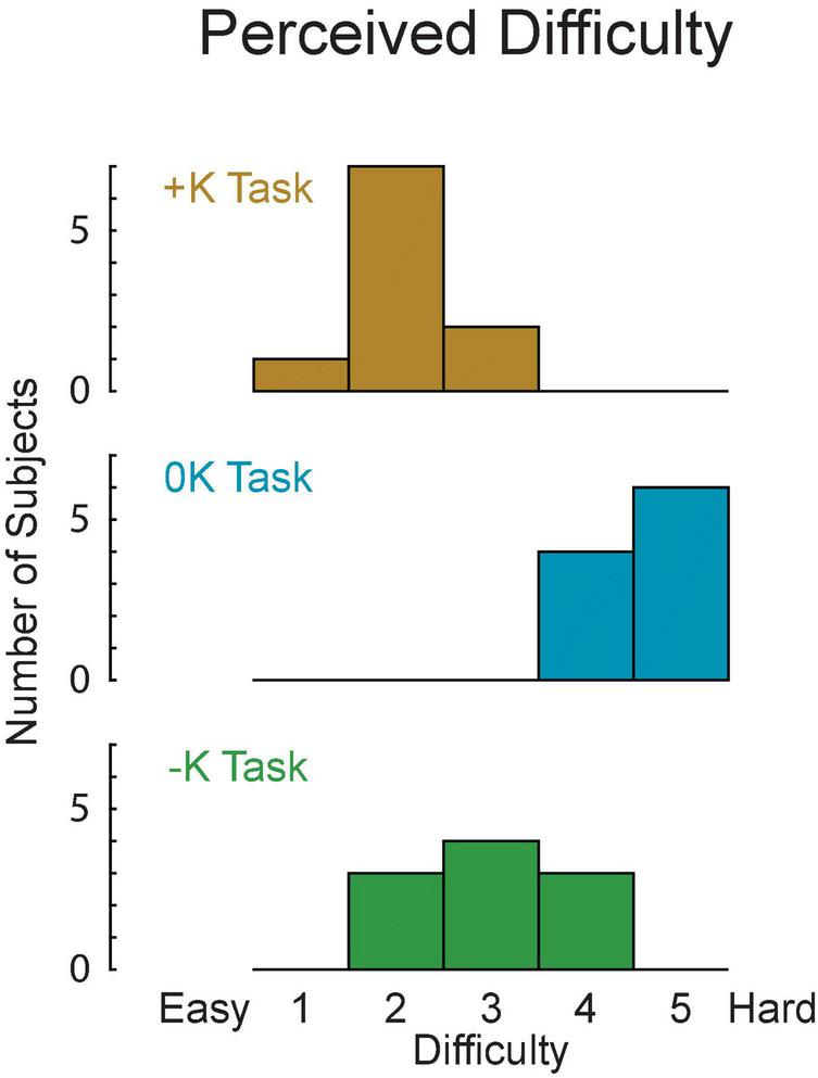 The +K task was perceived to be easier by the subjects, as rated on a 1–5 difficulty scale.