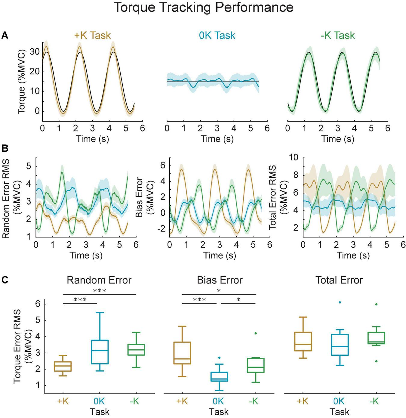 Task performance was quantified by how well the measured torque matched the torque target in all three tasks. (A) Representative data for one subject, showing the target (black), the average measured torque (colored lines) and standard deviation across all the cycles of the movement (shaded area). (B) Computed random, bias and total error and their variation throughout the imposed movement. Solid shows group average, shaded area shows 95% confidence interval of the group average. (C) While the total error did not differ between the three tasks, the +K task did show less random error, indicating a more consistent task behavior when subjects could rely more heavily on impedance. *p < 0.05; ***p < 0.001.