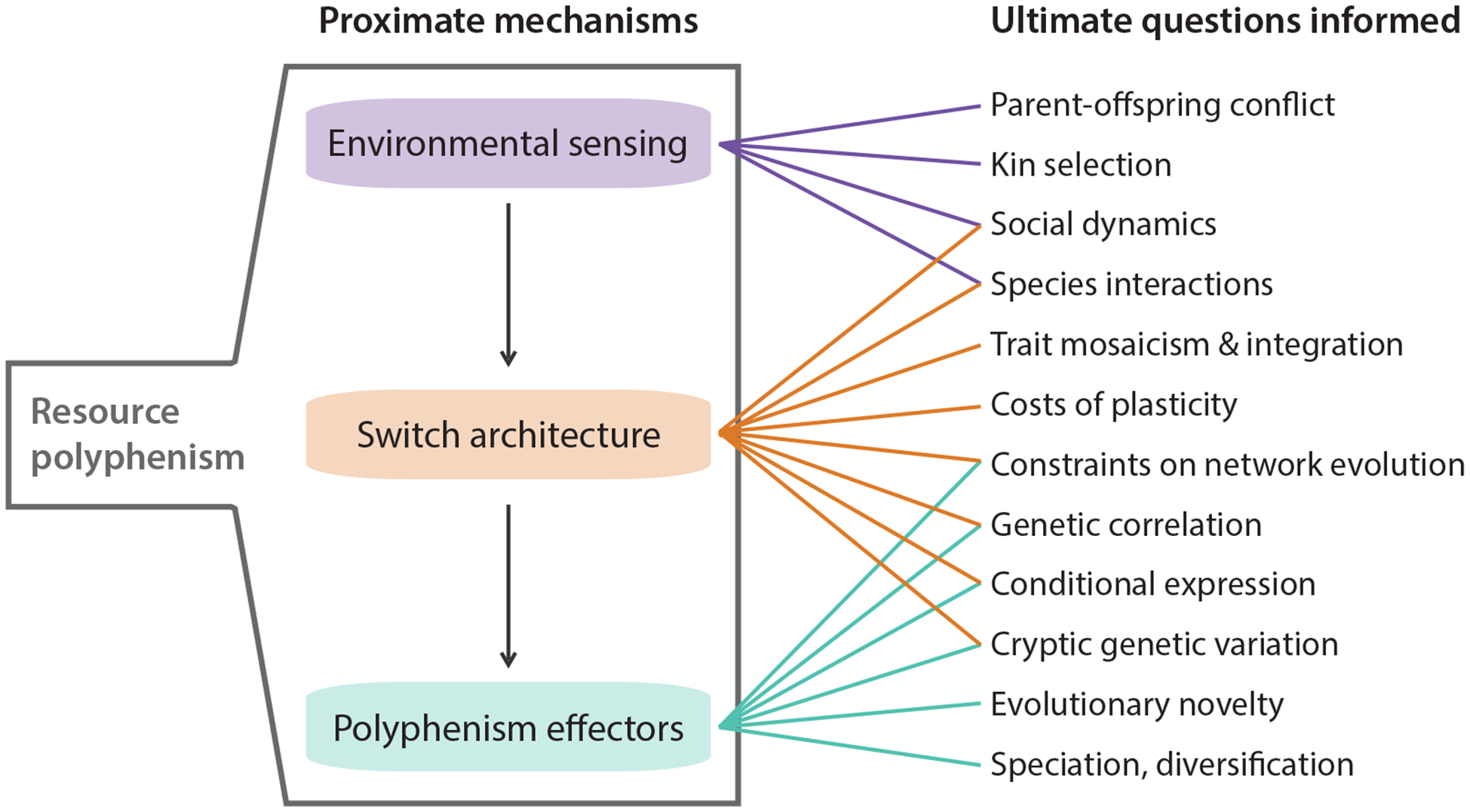 Highlighted areas where knowledge of resource polyphenism’s proximate mechanisms can inform ultimate questions about ecology and evolution.