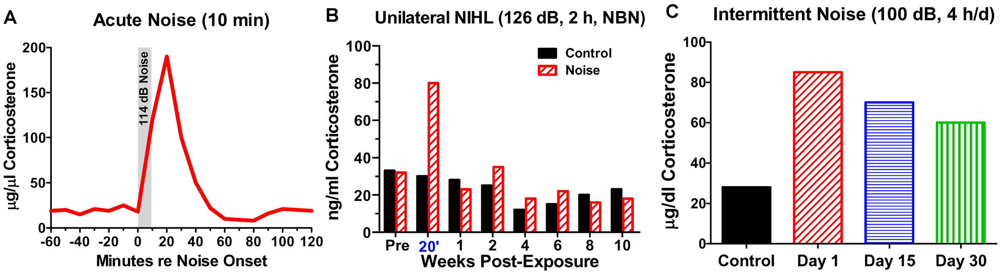 Noise-induced changes in corticosterone. (A) Schematic showing rapid rise and fall of serum corticosterone following a 10-min exposure to white noise presented at 114 dB SPL. (B) Schematic illustrating corticosterone levels measured over 12 weeks in sham control rats and rats exposed unilaterally for 2-h to 126 dB SPL narrowband noise (NBN) centered at 12 kHz. Corticosterone greatly elevated in noise group 20’ post-exposure, but levels decline to normal 1-week post-exposure. No significant difference in long-term basal corticosterone levels between control and noise-exposed group. (C) Schematic illustrating the rise in serum corticosterone following chronic intermittent noise presented at 100 dB SPL for 4-h/day over a period of 30 days. On day 1, corticosterone measured 30-min post-exposure while on day 15 and day 30, corticosterone was measured 24-h after the exposure.