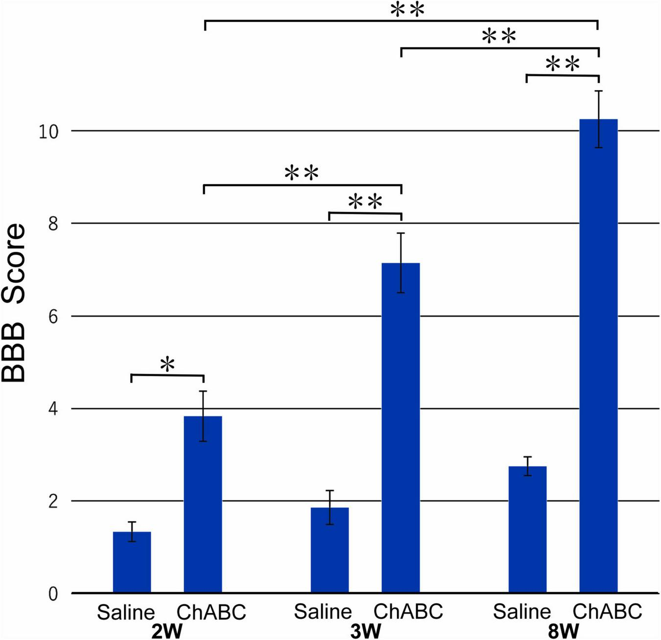 The Basso, Beattie, and Bresnahan (BBB) score of rats with ChABC or saline administration at 2, 3, and 8 weeks after complete spinal cord transection (CST). Significant differences are indicated by **p < 0.01 or *p < 0.05.
