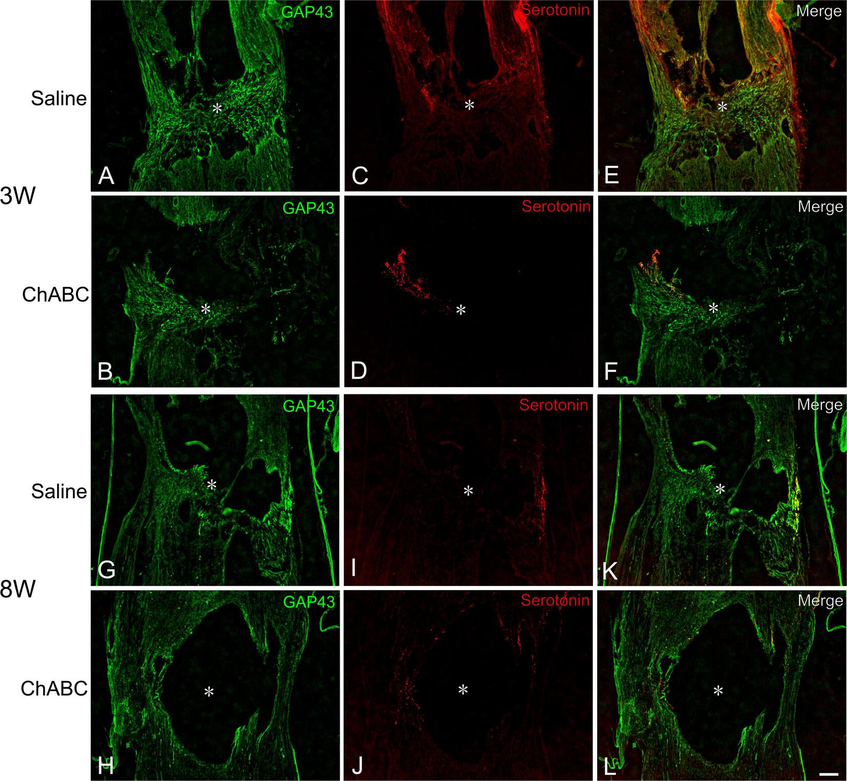Double-labeled images of immunohistochemistry for 5-hydroxytryptamine (5-HT) (red), and GAP-43 (green) in the lesion site of rats with saline (A,C,E,G,I,K), and ChABC (B,D,F,H,J,L) administration at 3 (A–F), and 8 weeks (G–L) after CST. Images of GAP-43 (A,B,G,H), 5-HT (C,D,I,J), and merged images (E,F,K,L) are shown. Arrows indicate nerve fibers doubly positive for 5-HT and GAP-43. Asterisks indicate the center of the lesion site. Scale bars = 100 μm.
