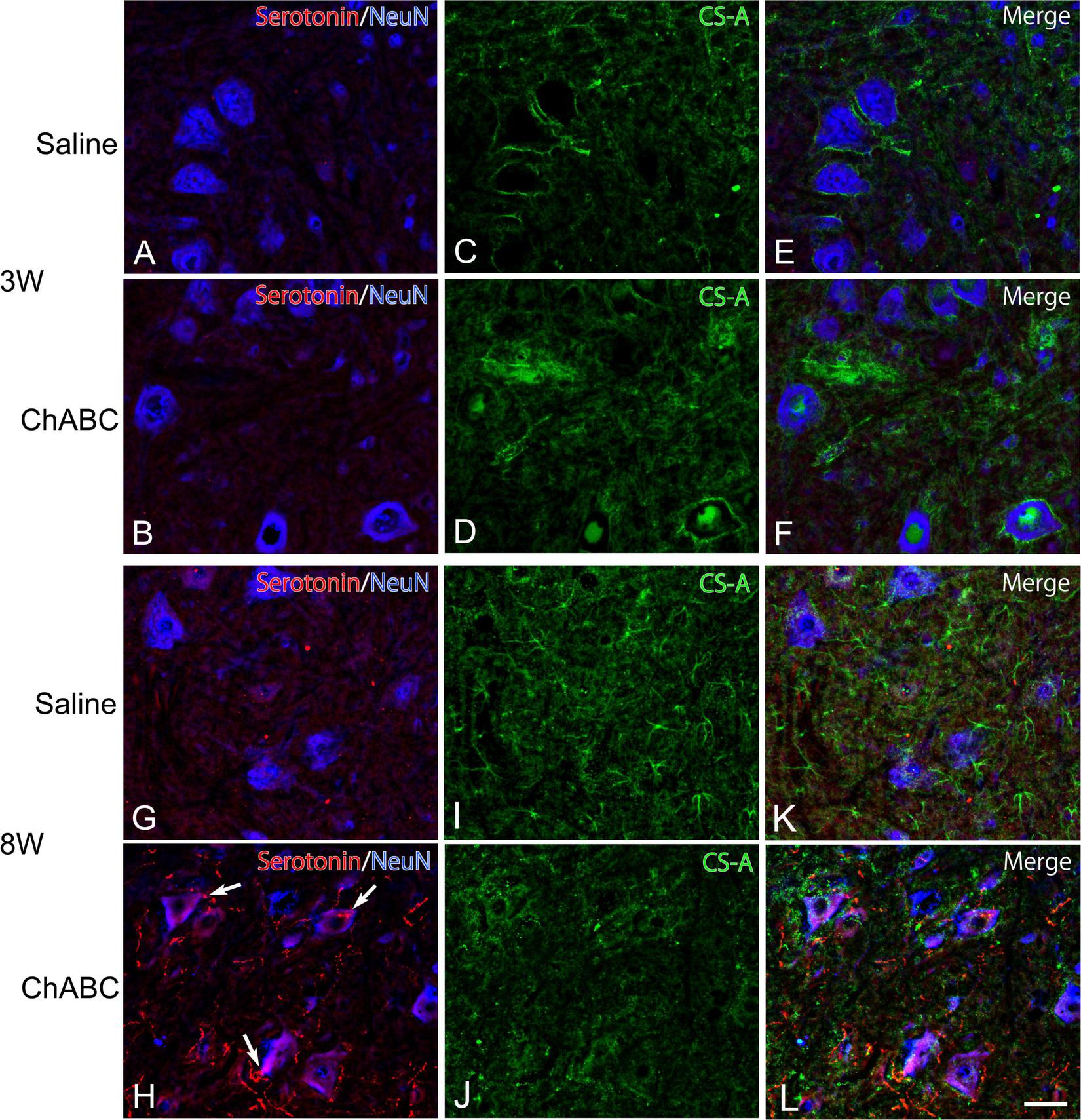 Images of immunohistochemistry for CS-A (green), Neu N (converted to blue), and 5-HT (red) in the L5 ventral horn of rats with saline (A,C,E,G,I,K), and ChABC (B,D,F,H,J,L) administration at 3 (A–F), and 8 (G–L) weeks after CST. Double-labeled images of 5-HT and NeuN (A,B,G,H), CS-A immunohistochemistry images (C,D,I,J), and merged images (E,F,K,L) are shown. Arrows in (H) indicate 5-HT nerve terminals on NeuN-positive motoneurons. Many 5-HT varicosities were also observed in (H,L). Scale bars = 50 μm.
