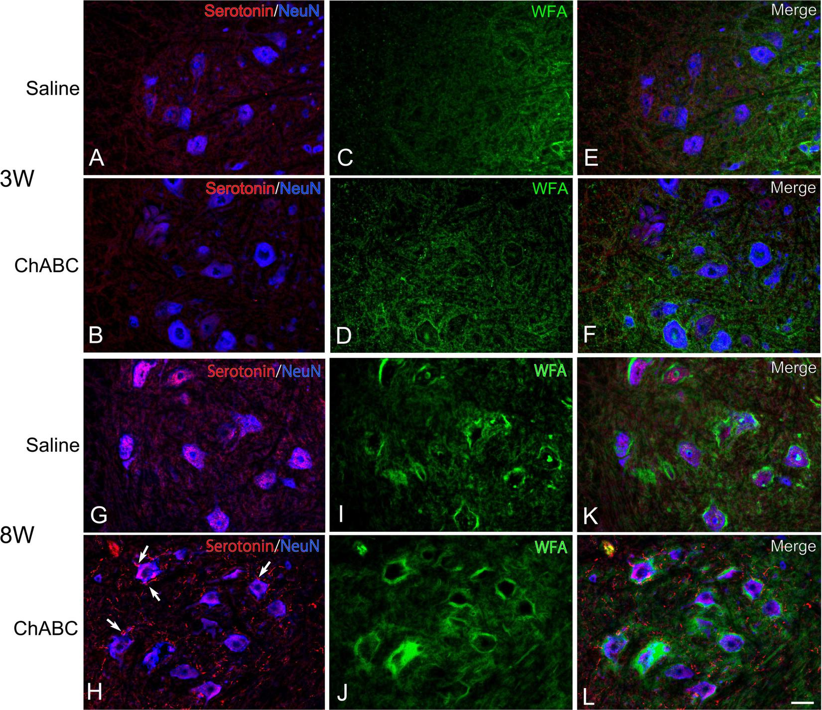 Images of Wisteria Floribunda agglutinin (WFA) histochemistry (green), and immunohistochemistry for NeuN (converted to blue), and 5-HT (red) in the L5 ventral horn of rats with saline (A,C,E,G,I,K), and ChABC (B,D,F,H,J,L) administration after 3 (A–F) and 8 (G–L) weeks after CST. Double-labeled images of 5-HT and NeuN (A,B,G,H), WFA histochemistry images (C,D,I,J), and merged images (E,F,K,L) are shown. Arrows in (H) indicate 5-HT nerve terminals on NeuN-positive motoneurons. Many 5-HT varicosities were also observed in (H,L). Scale bars = 50 μm.