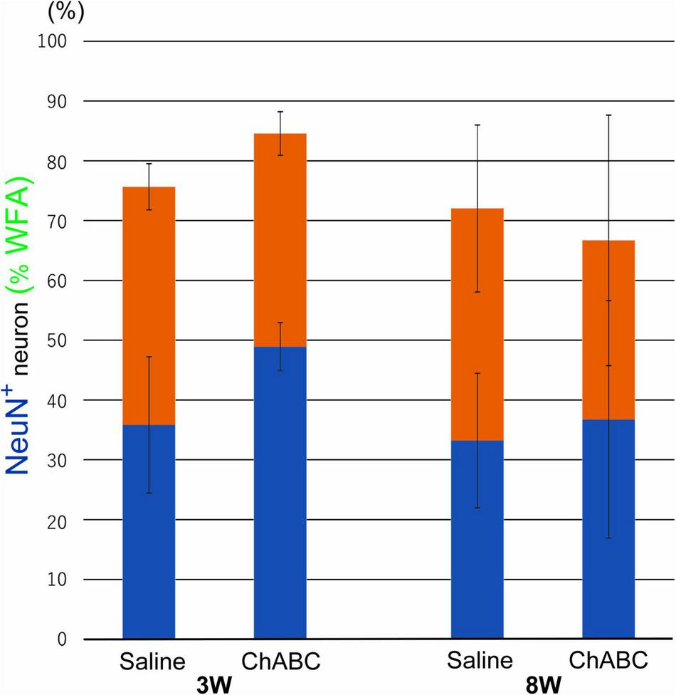Percentages of motoneurons whose cell bodies were covered with WFA-positive PNN structures among all motoneurons at 3 and 8 weeks after CST in rats with ChABC or saline administration. Blue bars indicate the percentage of motoneurons with > 80% WFA-positive structures, and red bars indicate the percentage of motoneurons with > 20% WFA-positive structures. Data are expressed as the mean ± SEM.