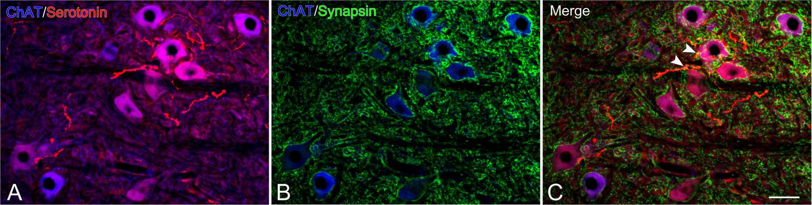 Images of immunohistochemistry for synapsin I (green), ChAT (converted to blue), and 5-HT (red) in the L5 ventral horn of rats with ChABC administration at 8 weeks after CST. Double-labeled image of ChAT and 5-HT (A), ChAT and synapsin I (B), and merged images (C). Arrowheads in (C) indicate nerve terminals doubly positive for 5-HT and synapsin I on motoneurons. Scale bars = 50 μm.