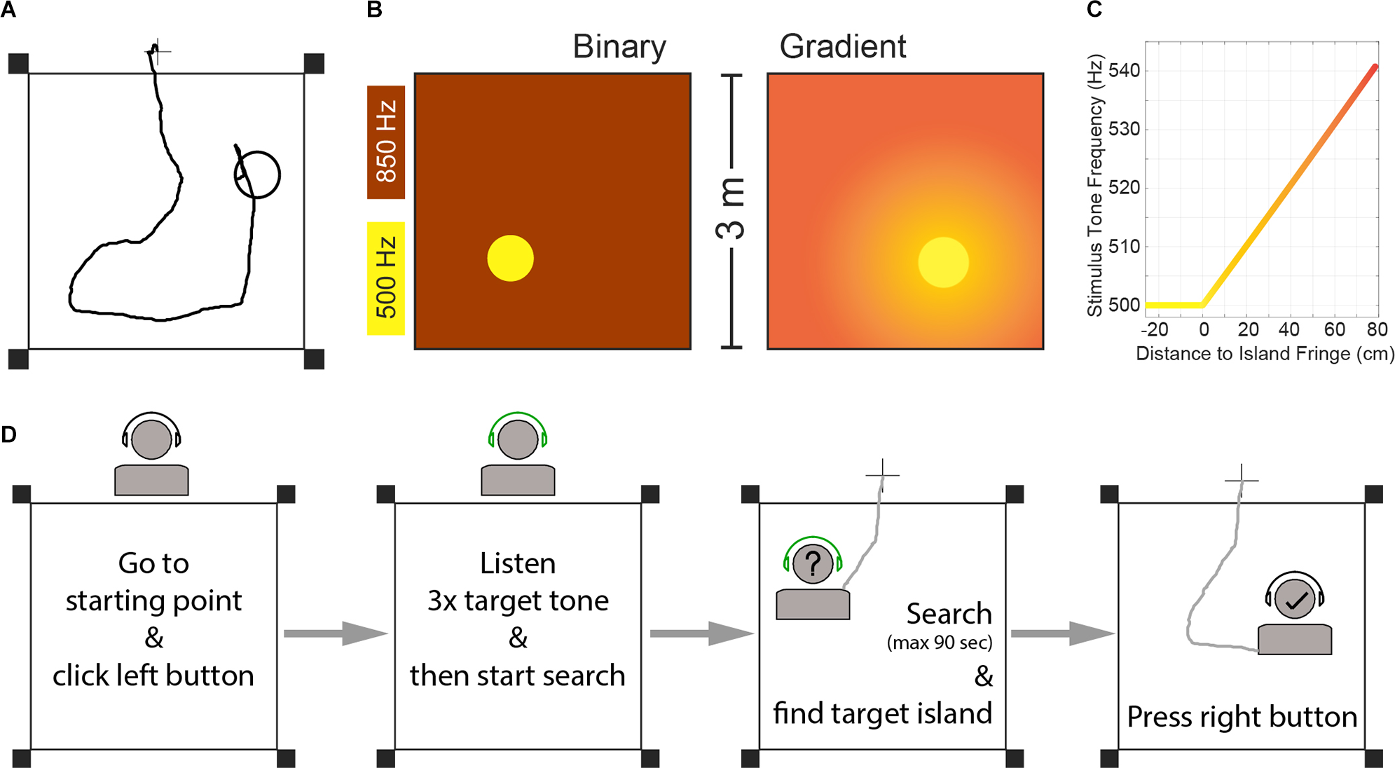 Inspired by our previous animal work, we analyzed two task versions, both based on low-frequency sound frequency perception (Figure 1B). A “binary” version, where the island and the outside area elicited two distinct frequency stimulations that are easily discriminated; and a gradient version, where the stimulation frequency depended on the distance to the target-island, inspired by the Hidden Object game that children play: