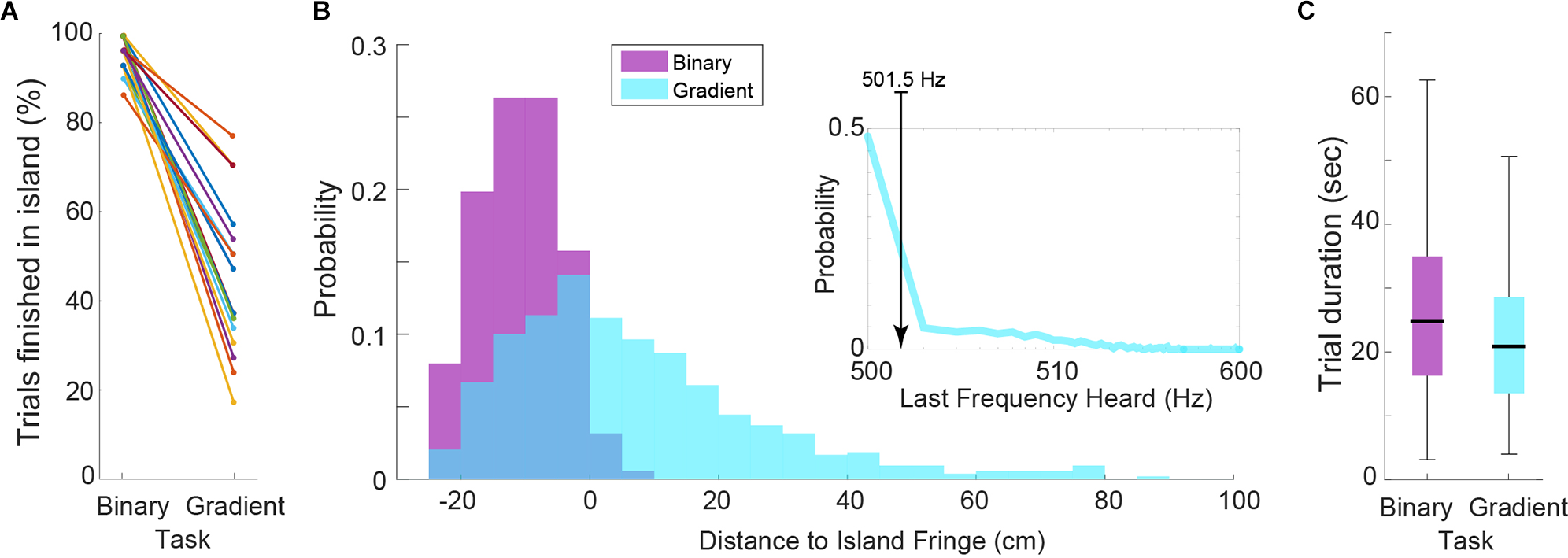 (A) Percentage of trials finished within the target island. Each line represents a subject. Note that while this measure is equal to performance in the binary task, it is not for the gradient task. (B) Histograms of the distance to island fringe for all trials across subjects for both task versions. Inset: Histogram of last frequency heard when subjects finished the gradient trials. Median of 501.5 Hz is shown. (C) Distributions of trial durations by task (P = 0.0253).