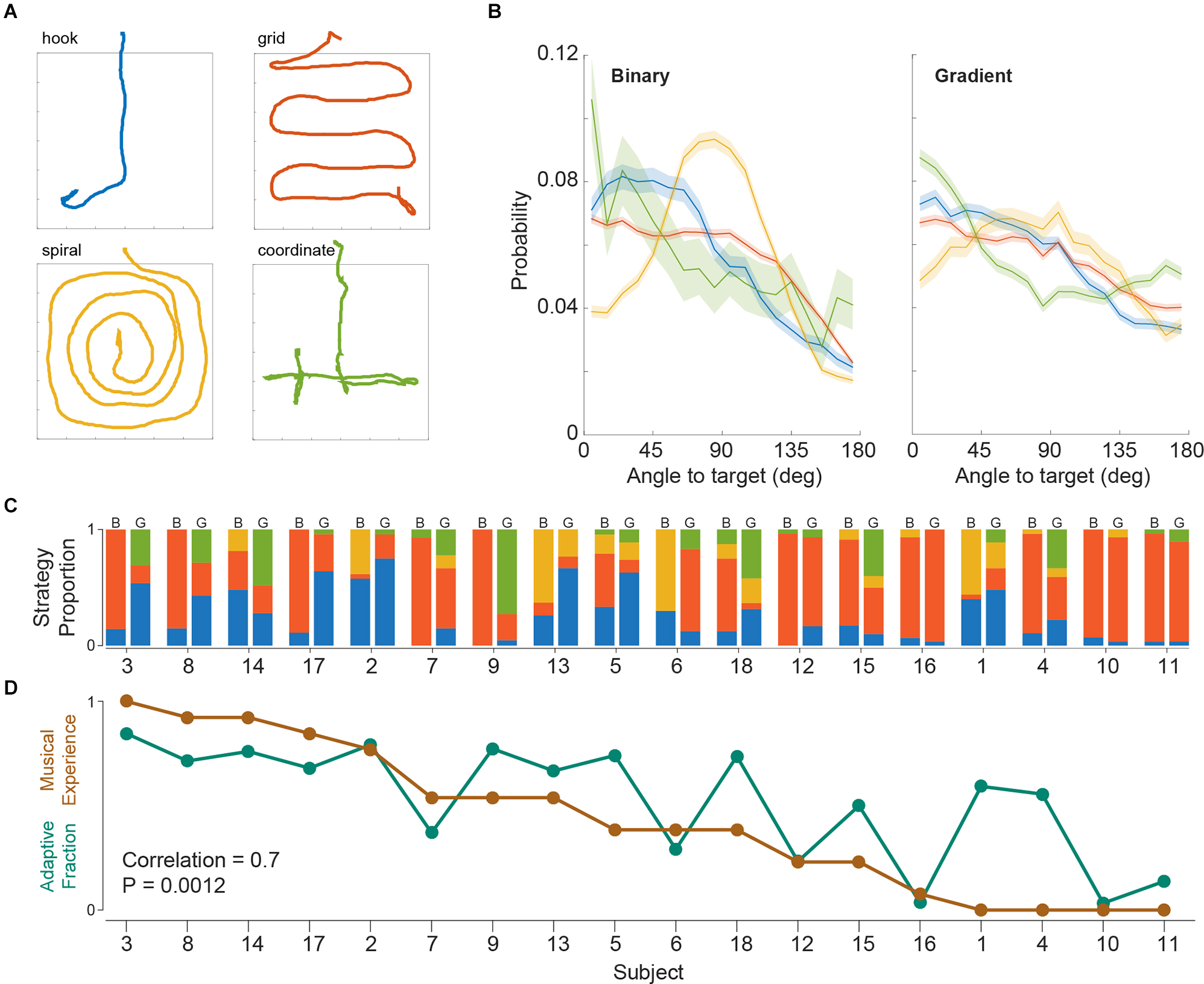 (A) Representative trials of the four stereotypical search strategies. (B) Angle to target histograms across strategies (median and 95% confidence interval). (C) Change in strategy use as a proportion of trials across subjects. Left and right columns per subject represent binary and gradient task versions respectively. Subject order is the same as panel (D). (D) Fraction of trials of hook + coordinate strategies (Adaptive Fraction), and normalized years of musical experience across subjects, for the gradient task.