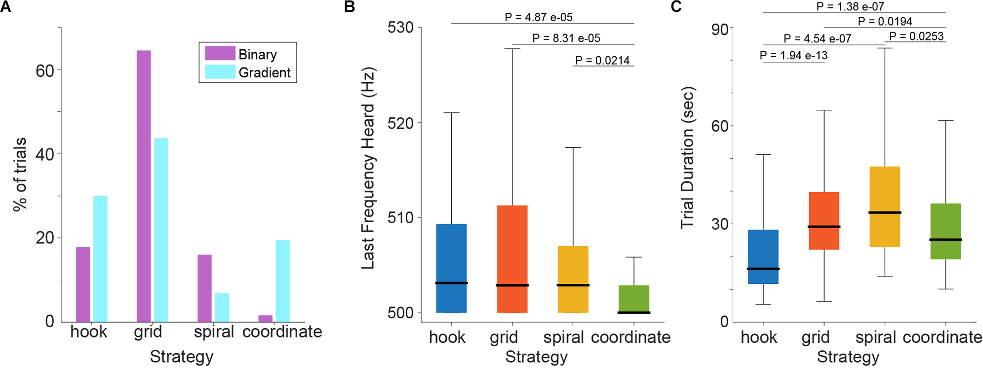 We also compared trial duration times across strategies (Figure 4C; Kruskal-Wallis test, P = 5.0732e-15; Median values: hook = 16.3 s, grid = 29.1 s, spiral = 33.5 s, coordinate = 25.2 s) and observed that the fastest strategy was the hook, followed by the coordinate (Mann-Whitney U-tests single tail, Holm-Bonferroni corrected; Phook-grid = 1.9402e-13, Phook-spiral = 4.5475e-07, Phook-coordinate = 1.3890e-07, Pcoordinate-spiral = 0.0253, Pcoordinate-grid = 0.0194).