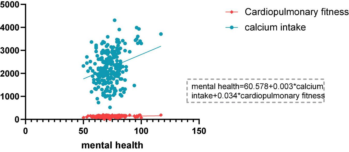 Childhood and adolescence are likely to be critical times for establishing good mental health but there is still much to be learned about factors that may have a positive impact on psychological health in childhood (Sawyer et al., 2012; Lubans et al., 2016). Diet and physical fitness have been paid special attention as important factors affecting mental health, but the underlying mechanism of their interaction is still unclear. Based on the above analysis, our research will further clarify and discuss the relationship between the three and provide methods and theoretical basis for adopting reasonable dietary behaviors and physical exercise to control and prevent adolescents’ mental health problems. We hypothesized that: (1) different components of physical fitness are differently associated with mental health and (2) lower calcium intake and cardiorespiratory fitness both predict lower levels of mental health.