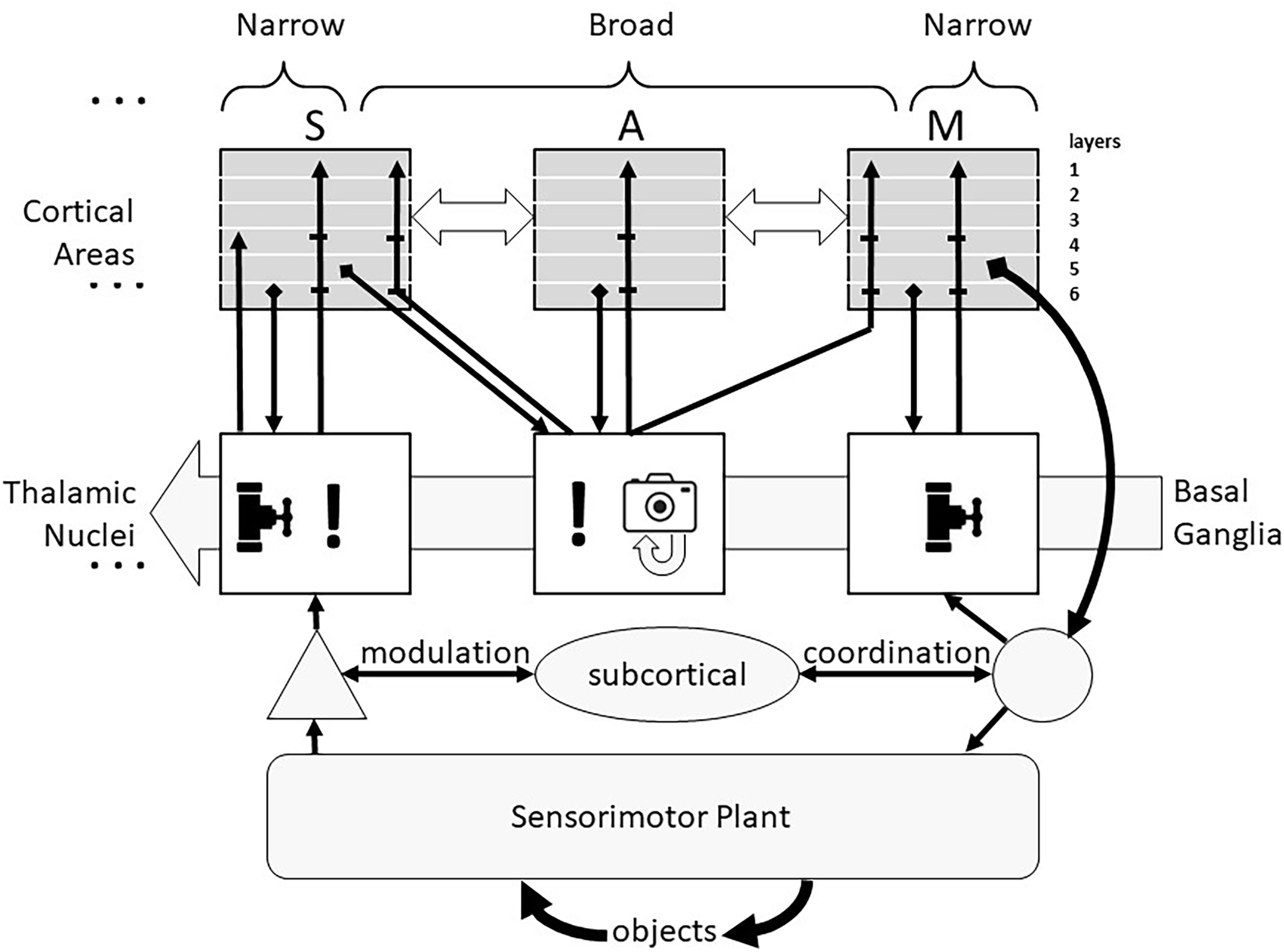 The common experimental paradigm of stimulus-response biases theories of computation toward a hierarchy of signal processing: temporospatial patterns of primary afferent activity followed by successively more compressed (i.e., abstract) remappings and ending with motor responses. This hierarchy breaks down, however, when corticothalamic circuits are considered from the perspective of continuous behavior involving sequences of exploratory movements and extracted percepts (Loeb and Fishel, 2014). Anterolateral and primary motor cortex and associated ventromedial thalamus have relatively Narrow loops (vertical projections and valve icon at right side of Figure 1). These are anatomically similar to those of primary sensory cortex (Collins and Anastasiades, 2019) but they can be thought of as the highest order of cognitive processing. Thalamocortical activity is necessary for the amplification and release of a voluntary movement plan from motor cortex (Sauerbrei et al., 2020) and for widespread recruitment of sensory cortical areas that might provide feedback to control the movement (Talati et al., 2005). This might arise directly from the Narrow corticothalamocortical loops of motor cortex and/or they might arise in a three component loop from cortex to striatum to thalamus and back to cortex (Şengör et al., 2008). Both would be consistent with the “actor-critic” theory of the role of the basal ganglia in reinforcement learning (Joel et al., 2002). Actor-critic systems that compare new data to model-based predictions have been widely developed for movement sequencing in robotics applications (Ciosek et al., 2019; Clavera et al., 2020).
