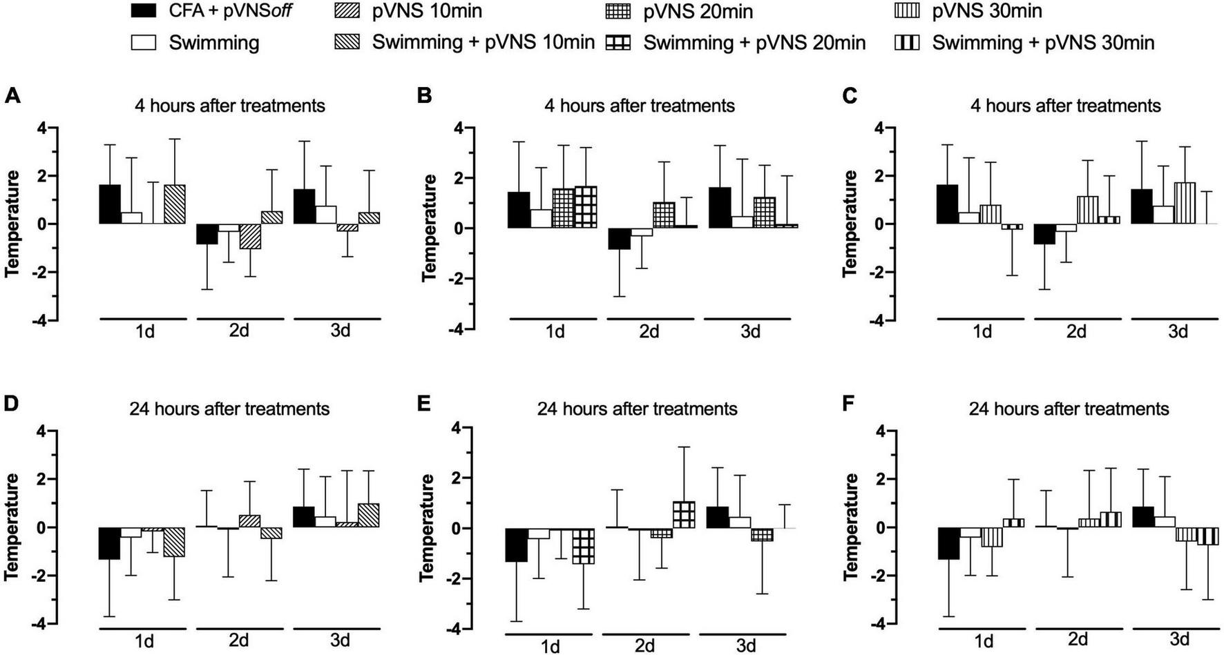 Effect of swimming associated with different times of percutaneous electrical stimulation of the auricular branch of the vagus nerve (pVNS) on paw temperature by intraplantar injection of Complete Freund Adjuvant (CFA). Groups: CFA control, swimming, pVNS 10 min and swimming + pVNS 10 min [panels (A,D)]. Groups: CFA control, swimming, pVNS 20 min and swimming + pVNS 20 min [panels (B,E)] and groups: CFA control, swimming, pVNS 30 min and swimming + pVNS 30 min [panels (C,F)] in the first-, second- and third-day post CFA injection. Each group represents the mean of eight animals. Two-way ANOVA followed by Bonferroni’s post-hoc test.