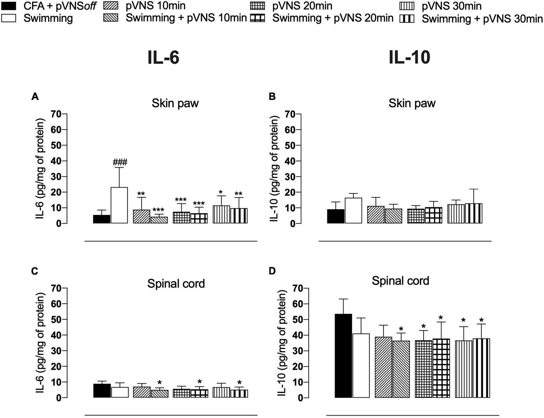 Effect of swimming associated with different times of percutaneous electrical stimulation of the auricular branch of the vagus nerve (pVNS) on cytokines levels in the paw skin [panels (A,B)] and spinal cord [panels (C,D)] interleukin-6 (IL-6) and interleukin-10 (IL-10), respectively, in mice with intraplantar injection of Complete Freund Adjuvant (CFA). Groups: CFA control, swimming, pVNS 10 min and swimming + pVNS 10 min, pVNS 20 min and swimming + pVNS 20 min, pVNS 30 min and swimming + pVNS 30 min in the fourth day post CFA injection. ###p < 0.001 when compared with the CFA control group. Each group represents the mean of eight animals. *p < 0.05, **p < 0.01, and ***p < 0.001 when compared with the swimming group. Two-way ANOVA followed by Bonferroni’s post-hoc test.