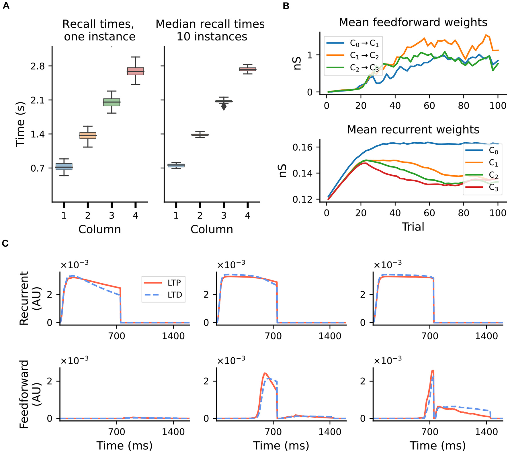 Accuracy of recall and evolution of learning. Results shown for a sequence of four intervals of 700ms. (A) Fluctuations in learning and sequence recall. We define recall time as the time at which the rate of the Timer population drops below 10spks/sec. Left: recall times for 30 trials after learning, for one network instance. Right: distribution of the median recall times over 10 network instances, with the median in each network calculated over 30 replay trials. (B) Mean synaptic weights for feedforward (Messenger to Timer in subsequent columns, top) and recurrent (Timer to Timer in the same column, bottom) connections for one network instance. (C) Mean LTP and LTD traces for the recurrent (top) and feedforward (bottom) connections, for learning trials T = 3, T = 15, and T = 35 and one network instance.