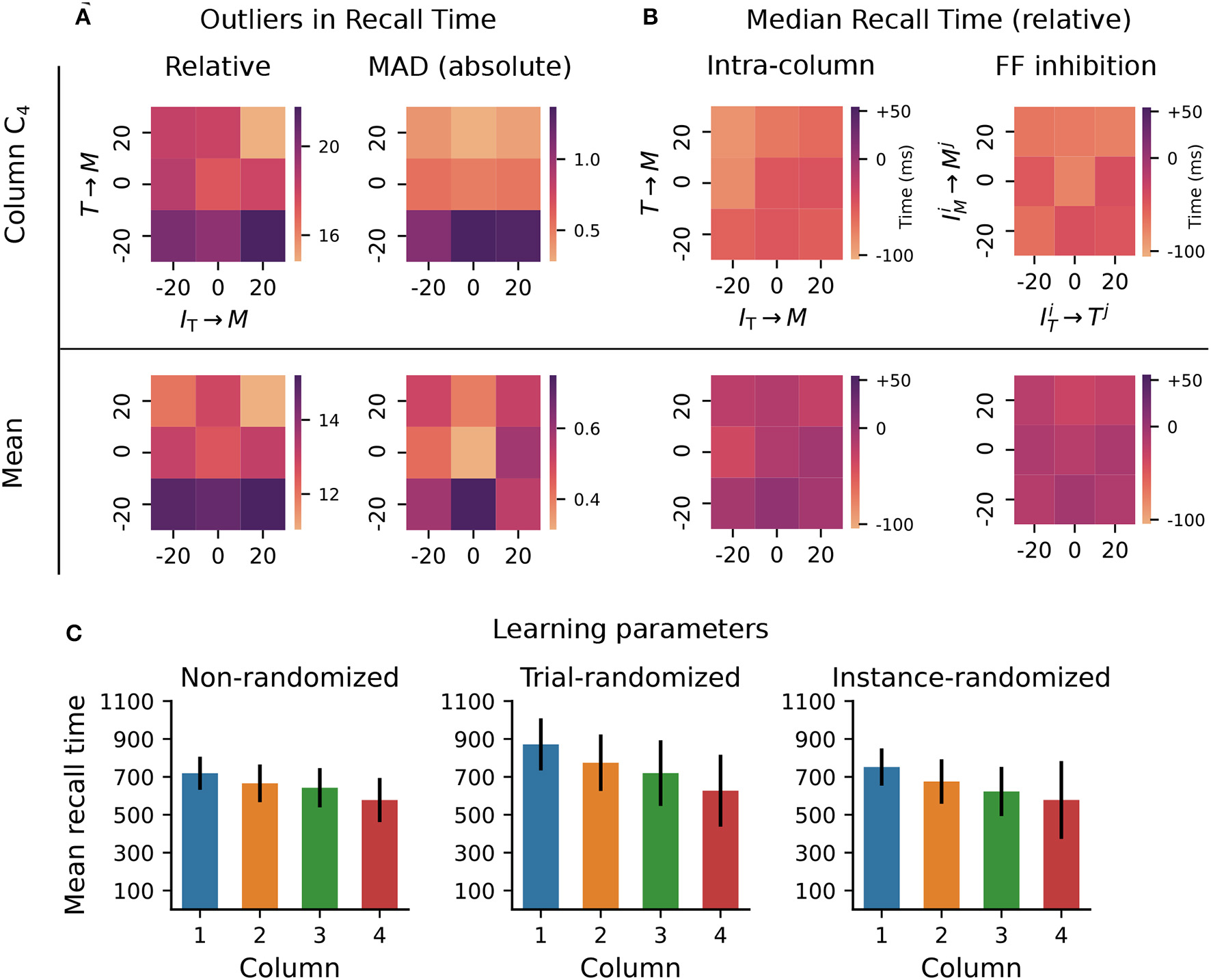 Robustness to variation in synaptic weights and learning parameters. The system was trained on a sequence of four elements, each with a duration of 700ms. For the Timer cells, we define relative recall time as the recall time relative to stimulation onset, i.e., the time from the expected onset time (0; 7,00; 1,400; 2,100) in the sequence until the rate drops below a threshold of 10spks/sec. Conversely, absolute recall time is simply the time when the rate drops below threshold (relative to 0). (A) Number of outlier intervals reported during 50 recall trials, as a function of the percentage change of two synaptic weights within a column: excitatory Timer to Messenger, and inhibitory IT to Messenger. Top row shows the number of outliers, defined as a deviation of ±140 ms from the correct interval relative to expected onset (left), and the number of outliers detected using a modified z-score (threshold >3, right panel) based on the median absolute deviation in column C4 (see main text). Bottom row shows the respective outliers averaged over all four columns. (B) Deviation of the median recall time from the expected 700ms, as a function of the excitatory and inhibitory synaptic weights onto the Messenger cells in a column (left), and as a function of the cross-columnar (Ci≠Cj) inhibitory synaptic weights within the same layers (right). Top and bottom row as in (A). All data in (A, B) is averaged over 20 network instances. (C) Mean recall time of a four-element sequence of 700ms intervals, over 50 recall trials of a single network instance. Left: baseline network. Center: during each training trial, the learning parameters (see main text) are drawn randomly and independently from a distribution of ±20% around their baseline value. Error bars represent the standard deviation. Right: the set of learning parameters is drawn randomly once for each network instance, with data shown averaged over 10 instances.