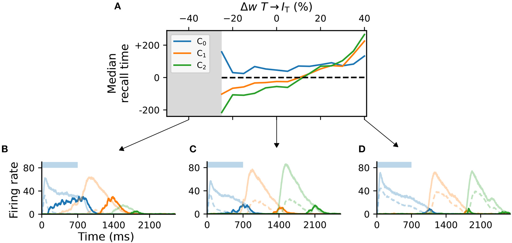 Activity of L5 inhibitory population is critical for accurate learning. (A) Deviation of the median recall time of three intervals of 700ms, as a function of the change in synaptic weights T→IT relative to baseline (Δw = 0). Gray area (<−25%) marks region where learning is unstable (not all elements can be recalled robustly). Data is averaged over five network instances. (B–D) Characteristic firing rates during recall for values deviations of −25, 0, and 40% relative to baseline. Solid curves represent the excitatory populations as in Figure 1, while dashed curves indicate the respective inhibitory populations IT in C_i.