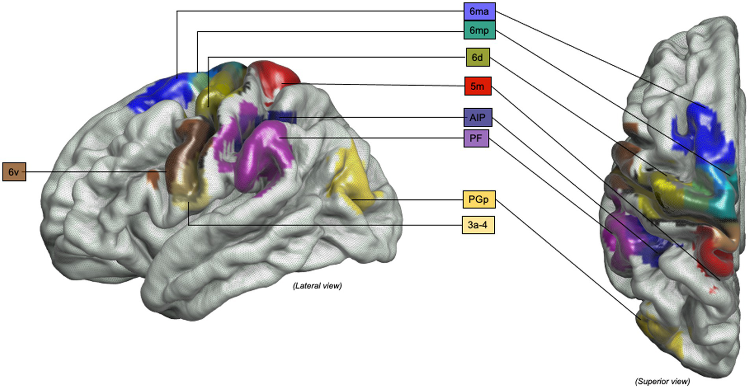 Object-oriented hand manipulation network in humans: Graphical representation of the object-oriented hand manipulation network (within the praxis-representative network) in humans. Atlas, Human Connectome Project-MMP1.0; 3a-4, Brodmann areas 3a-4; 5 m, Brodmann area 5 medial; 6ma, Brodmann area 6ma (preSMA, mesial SFG); 6mp, Brodmann area 6mp (SMA, mesial SFG); 6d, Brodmann area 6d, premotor area dorsal; 6v, Broadmann area 6v, premotor area ventral; AIP, Anterior IntraParietal area; PF, Inferior Parietal Lobule area PF; PGp, posterior portion of human Angular Gyrus.