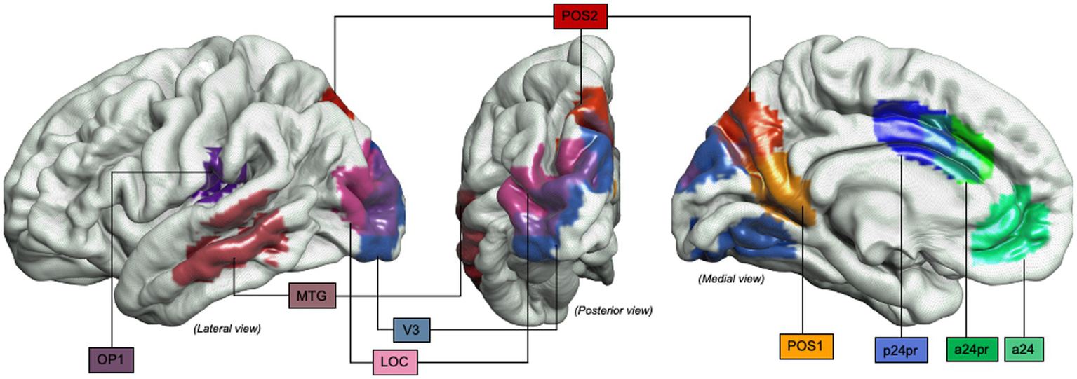 Object-oriented hand manipulation network in humans (extended view): Graphical representation of the extended object-oriented hand manipulation network (within the praxis-representative network) in humans. Atlas, Human Connectome Project-MMP1.0; a24, subdivision of Anterior Cingulate Cortex; a24pr, subdivision of the anterior part of Middle Cingulate Cortex; LOC, Lateral Occipital Cortex; MTG, Middle Temporal Gyrus; OP1, Operculum Parietal 1 area; p24pr, subdivision of the posterior part of Middle Cingulate Cortex; POS, Parieto-Occipital Sulcus; V3, Visual Area 3.