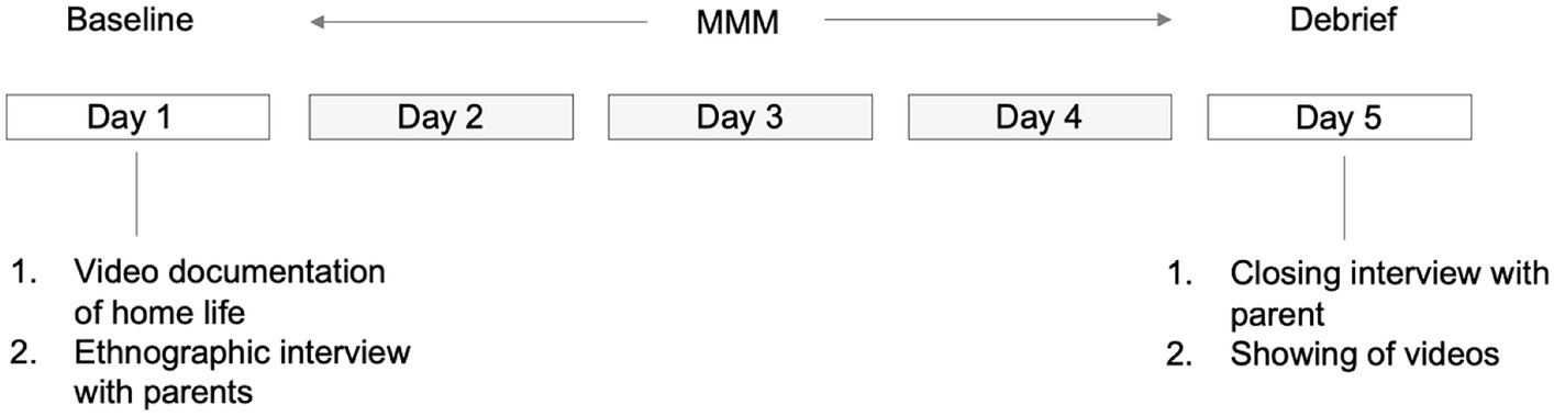 This study integrates two approaches, namely video-based fieldwork, and design-based research. Video ethnography centered around studying situated human interaction is an approach that involves setting up cameras or entering a research site with a “roving camera” (Heath et al., 2010, p. 38). Video recordings provide evidence and accurate grounds for observable phenomena (Garfinkel, 1967; Sacks, 1992), and additionally allow the research team to evaluate their own interactional practices with participants. In this study, two stationary cameras were set up at corners of the participants’ living rooms, and a roving camera was held by at least one research team member. The video data was supplemented with an ethnographic interview with each mother on the first day of the study.