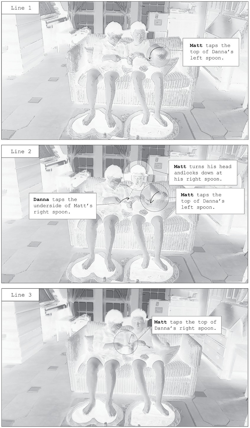 As Figure 4 demonstrates, when Matt joins his mother (Danna) on the couch, she offers him two spoons. Matt and Danna hold a spoon in each hand, and Danna then slips her left hand through the gap between his forearm and the side of his body. With their forearms intertwined, Danna raises the spoon in her left hand towards the spoon in Matt’s left hand. Danna’s action offers her spoon as a surface for Matt to tap upon. Unlike the PUOH gesture, which poses the possibility that Danna close her fingers around Matt’s spoon, Danna’s spoon is a material surface that cannot perform control touch upon Matt’s spoon. Matt takes up the offer, repetitively using the spoon in his left hand to hit her spoon (line 1), creating a loud ‘clang’ each time they hit utensils. Tinkly piano sounds also play each time Matt’s and Danna’s utensils touch one another. After a few taps, Danna raises her right hand towards Matt’s right hand (line 2). Matt’s eye gaze shifts from his left hand to his right hand, and for a moment, he glances at the spoon in his mother’s hand. Matt begins to tap his mother’s spoon with his right hand, pausing the tapping in his left hand (line 3). After a few cycles of tapping upon Danna’s spoon, Matt encounters another invitation from Danna to tap upon her left spoon with his left hand. Matt responds by tapping with his left hand, and thus, enters into a repetitive cycle that is different from his usual tapping. He alternates between tapping with his left and right hands, alternating between the taps even during later cycles, without Danna’s invitations. These alternating taps are also simultaneously felt by Danna as her spoons are tapped upon. She ensures that the spoons are close enough to Matt’s hands so that he can continue tapping on them with ease. After a few rounds of this new repetitive cycle, Matt begins to explore larger stim movements: he extends his spoon at varying distances from Danna’s spoon, creating different sounds as he brings his hand down to tap. Stronger taps create quicker and higher pitched musical sounds, and lighter taps create slower and lower pitched musical sounds. A few rounds after, Matt holds his spoon still, and Danna begins to tap upon it. Both parent and child take turns in tapping and offering their spoon to be tapped upon.