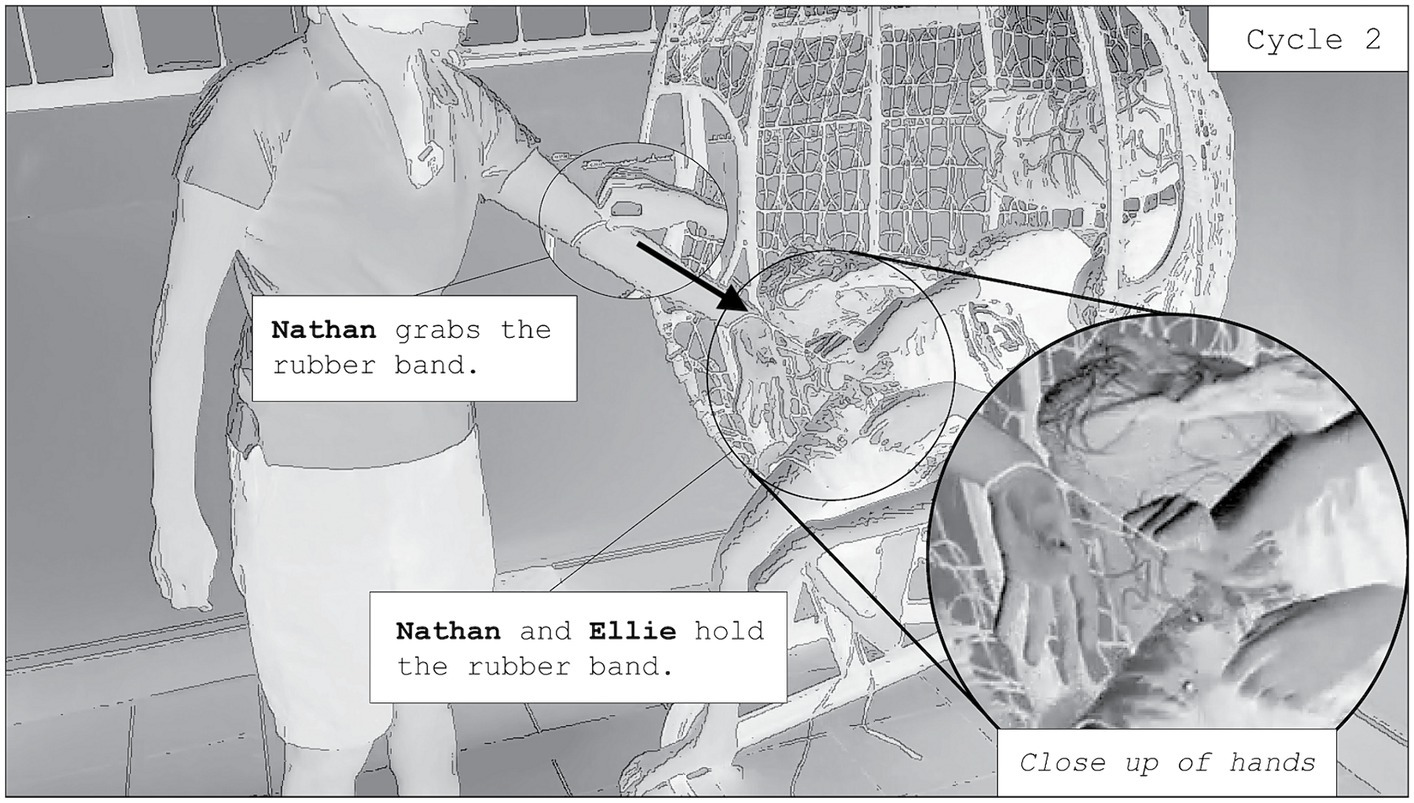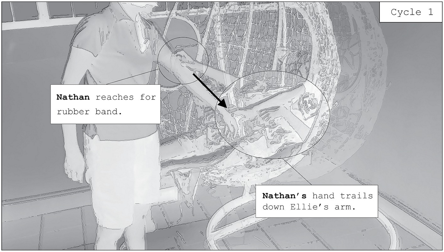 Nathan’s interactions with his mother involve repetitive cycles of swinging back and forth. Through these cycles, the interaction gradually evolves, with Ellie facilitating the momentum of the swinging through the tension of the elastic band held between her hand and Nathan’s. This interaction is sustained and mutually elaborative because Ellie does not control the momentum of Nathan’s swings. She allows him to be in control of his swinging, her social actions serving only to auditorily and haptically enhance his ongoing repetitive movement. Nathan himself participates in the interaction, evolving their interaction and gradually elevating his unfolding sensory experience. First, he touches Ellie’s forearm as he swings, sonically amplifying the trajectory of each swing backwards (cycle 1). Next, he grabs the hairtie, using its tension to produce quicker swings towards her. He then laminates further action upon the interaction, kicking her legs and adding more musical sounds. Eventually, he removes the mat from under him and instead places it on his lap, crinkling its surface with one of his hands, adding to his ongoing sensory experience. Nathan transforms his swinging experience accumulatively, amplifying his sensory experience to include a variety of sounds, changes to the motion of his swinging, and crinkling the mat as he swings. Nathan’s usual swinging practice, typically produced by himself, now becomes an amplified sensory experience that is shared with his mother. They establish new swinging cycles that collaboratively evolve over time.