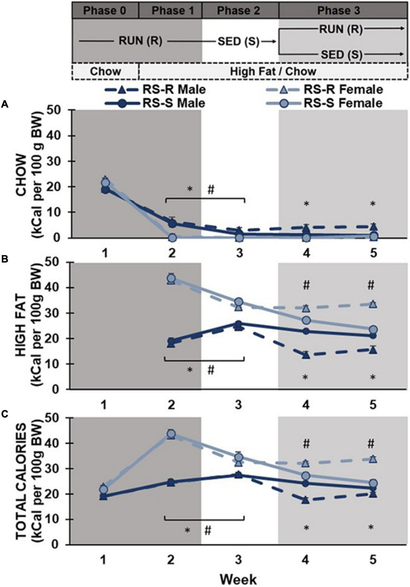 Average daily caloric consumption of chow diet, high fat diet, and total calories normalized to 100 g body weight. (A) Chow diet: Both males (*p < 0.05) and females (#p < 0.05) showed a significant decrease in chow consumption when transitioned from phase 1 to 2. During phase 3, RS-R males consumed more chow than RS-S males (*p < 0.05). (B) High fat diet: Males (*p < 0.05) increased while females (#p < 0.05) decreased high fat consumption when transitioned from phase 1 to 2. During phase 3, RS-S males consumed more high fat than RS-R males (*p < 0.05), while RS-R females consumed more high fat than RS-S females (#p < 0.05). (C) Total caloric consumption: Males (*p < 0.05) increased while females (#p < 0.05) decreased calorie consumption when transitioned from phase 1 to 2. During phase 3, RS-S males consumed more calories than RS-R males (*p < 0.05), while RS-R females consumed more calories than RS-S females (#p < 0.05).