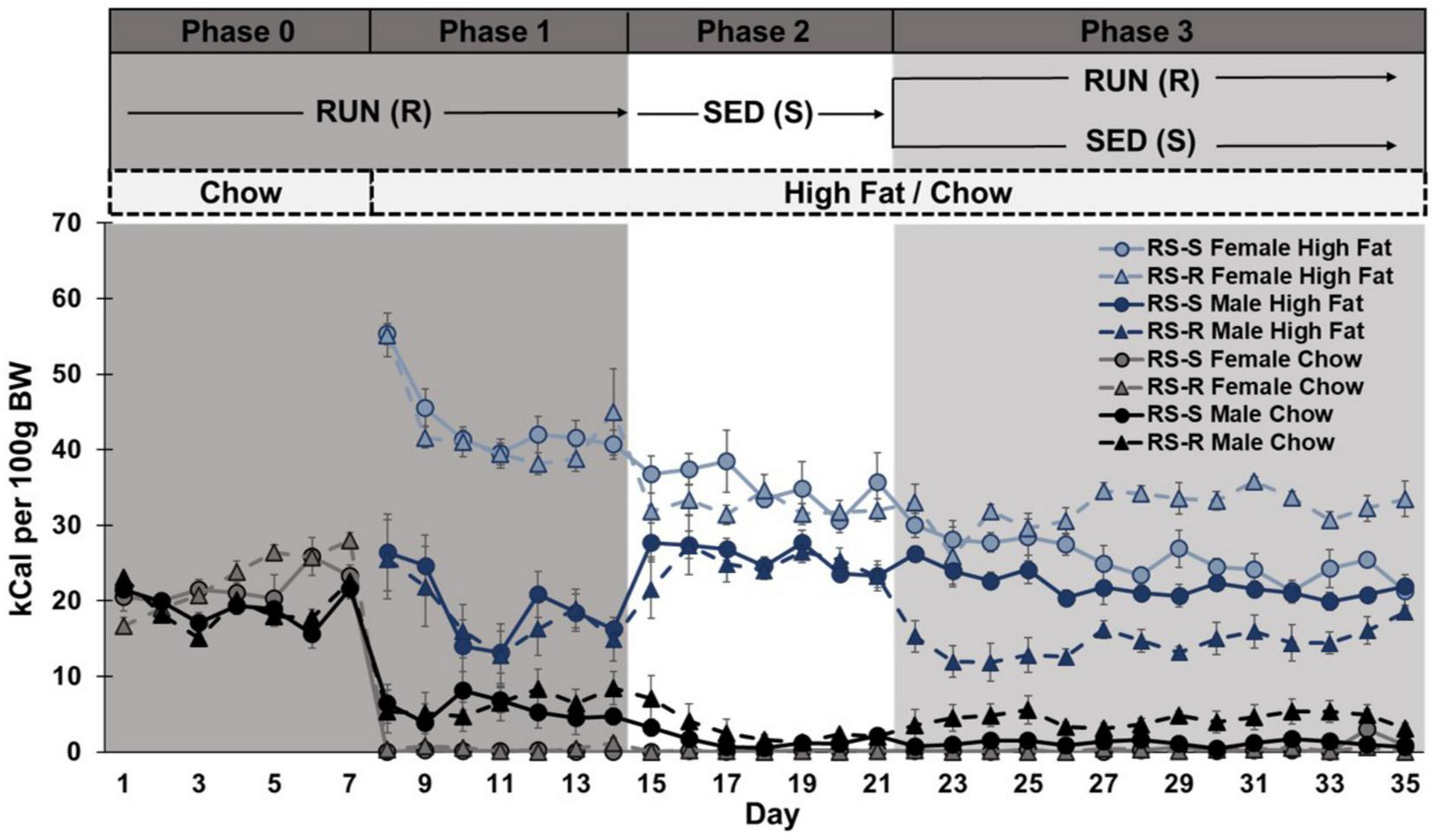 Phase 2 and 3: When comparing high fat consumption differences between Phase 2 (SED condition) and Phase 3 week 4 (half remain in SED condition and half transition to RUN condition), a two-way repeated measures ANOVA revealed a main effect of week (F1,28 52.7, p < 0.001), sex (F1,28 94.1, p < 0.001), and group (F1,28 4.6, p = 0.042). There was a significant interaction of sex by group (F1,28 9.9, p = 0.004), week by group by sex (F1,28 21.9, p < 0.001), but not week by sex (F1,28 3.6, p > 0.05) or week by group (F1,28 0.3, p > 0.05). Post hoc comparison revealed that females consumed more high fat than males across both weeks (p < 0.001). While both RS-S males who remained in the SED condition (p = 0.04) and RS-R males who transitioned to RUN condition (p < 0.001) decreased their high fat consumption from Phase 2 to 3, RS-R condition males decreased at a much larger scale (p < 0.001). RS-S females who remained in the SED condition decreased their high fat consumption from Phase 2 to 3 (p = 0.010), while high fat consumption for RS-R females who were placed in RUN condition in Phase 3 did not differ between phases (p > 0.05) (Figure 2).