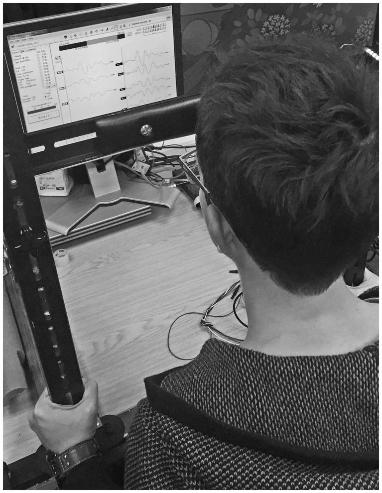 Participants were asked to push against a padded bar with their foreheads, maintaining tension in the sternocleidomastoid tension as close as possible to 50 µV root mean square throughout testing. The Eclipse clinical software provided biofeedback helping participants to monitor sternocleidomastoid tension.