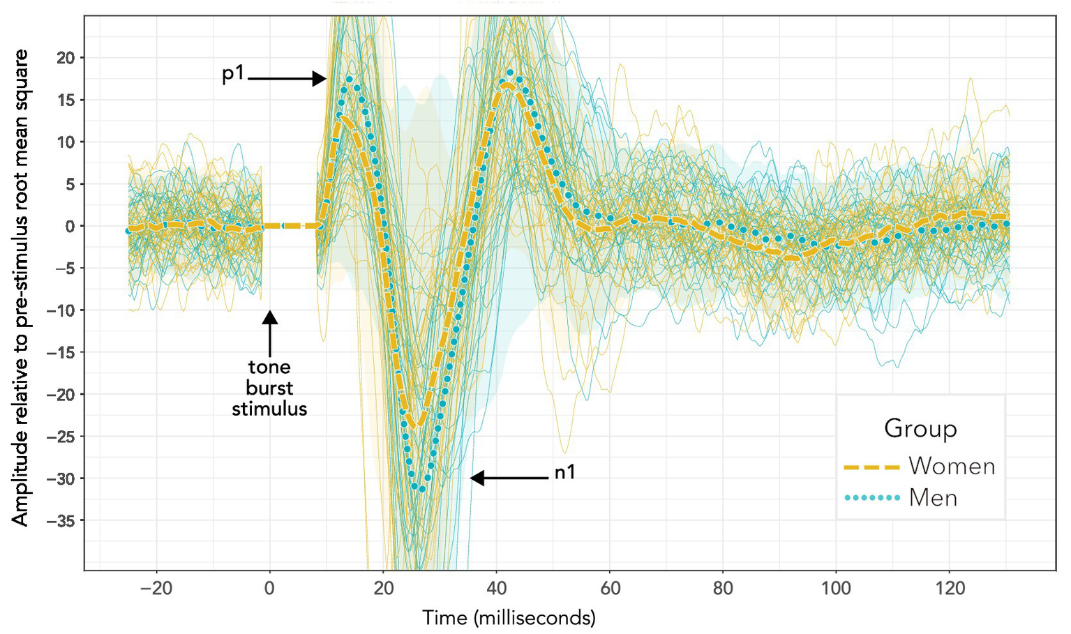 VEMP grand averages recorded following 500 Hz tone bursts presented using bone conduction at 40 dB HL. Distinct sequences for individuals within each group are also shown (more lightly drawn traces than the grand averages) along with 95% confidence intervals (shaded areas). Visual inspection of the waveforms suggests a difference in p1–n1 amplitude, but not p1–n1 latency. However, such an interpretation is misleading. Firstly, these data do not enable a valid statistical comparison, since there were uneven presentation counts across women and men. Secondly, averaging the data to enable statistical comparison shows a significant group difference in p1–n1 latency but not p1–n1 amplitude. Statistical analyses are reported in section 3, and discussed in section 4.