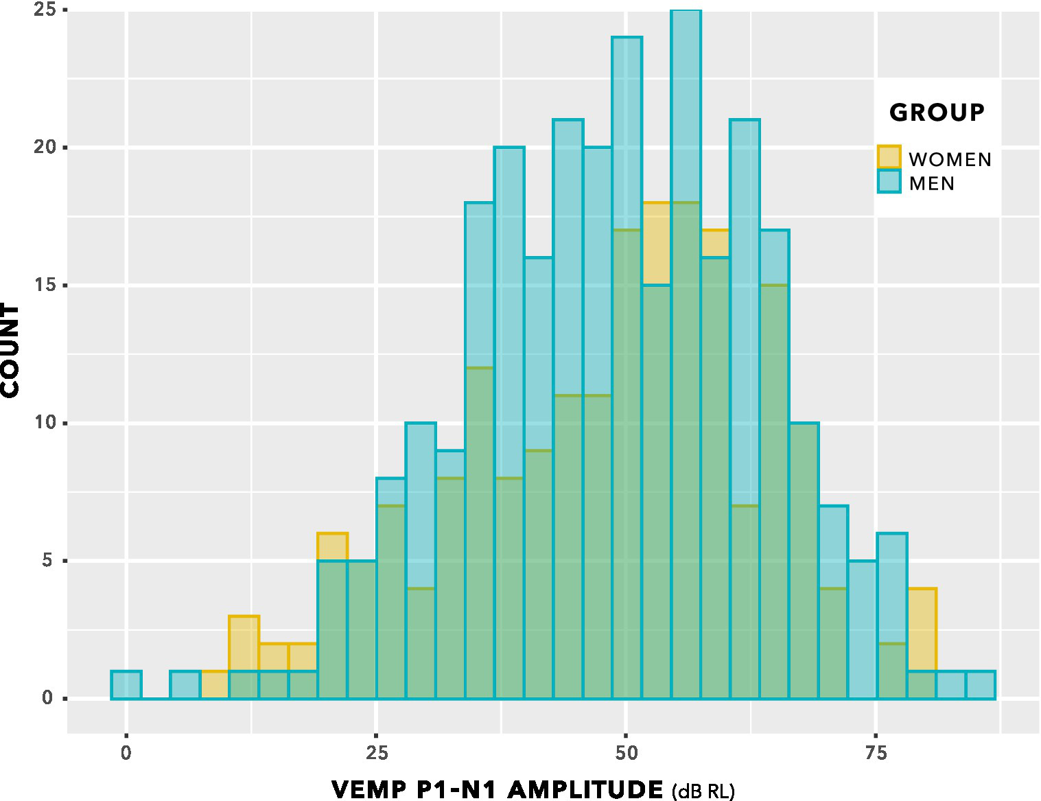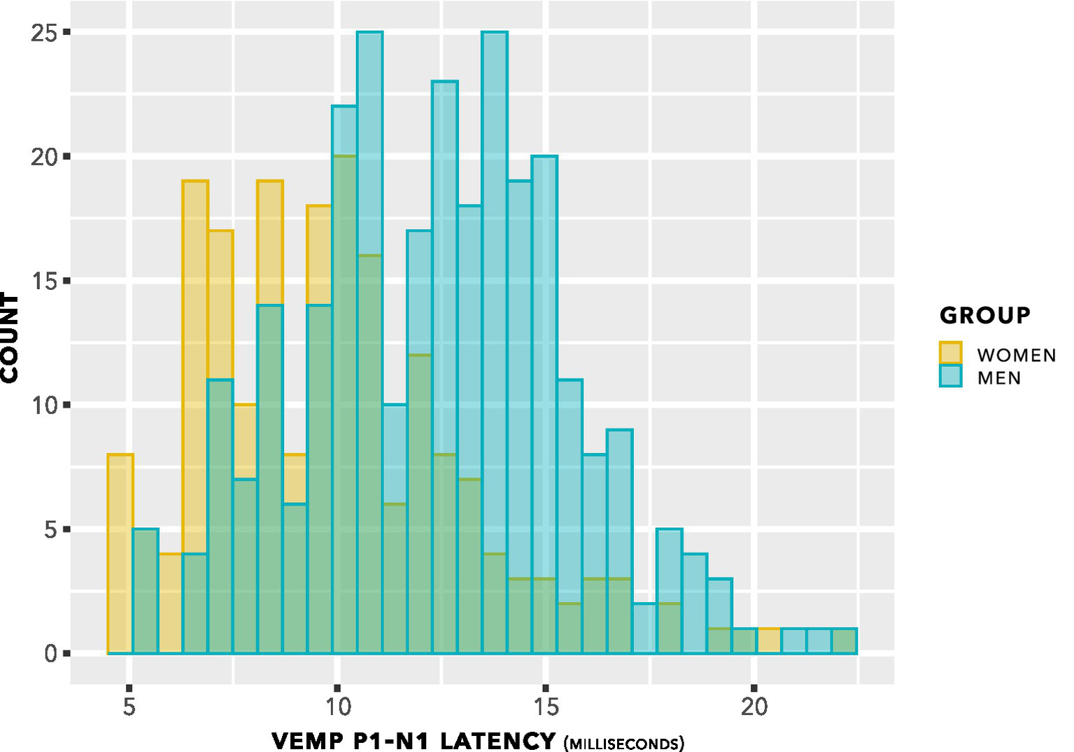 The histogram in Figure 5 shows counts of VEMP p1–n1 latency measurements sorted into female and male participants. The histogram does not show detail of participant or stimulus level. Inclusion of repeated measurements in the histogram means that it is not appropriate for statistical comparisons. However, the presentation count was approximately equal per participant, and was carried out over approximately the same stimulus range. Therefore the histogram gives an indication of distribution for each group. Both the female and male groups appear to have approximately normal distributions. It is apparent that slightly more data have been collected from men than from women. There is a suggestion of difference between the means of the group distributions.