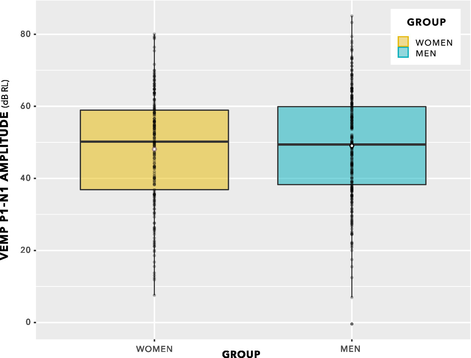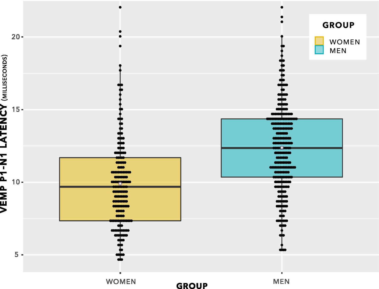 VEMP p1–n1 latencies. The even spacing on the ordinate was due to the 3 kHz sampling rate. VEMP p1–n1 latencies are grouped in steps of 0.33 ms, which was the maximum resolution of the Eclipse when using VEMP protocols. To provide an indication of when several data points were recorded at the same VEMP p1–n1 latency, data points have been plotted using the beeswarm feature in ggplot (R Core Team, 2020). This feature has introduced variation along the abscissa corresponding to the quantity of data present. Mean values for each group are shown as white data points. The box plot suggests there will be a group difference in VEMP p1–n1 latency, however it contains repeated measurements per participant and as such does not entirely reflect data appropriate for use in statistical analysis. Statistical analyses are reported in section 3, and discussed in section 4.