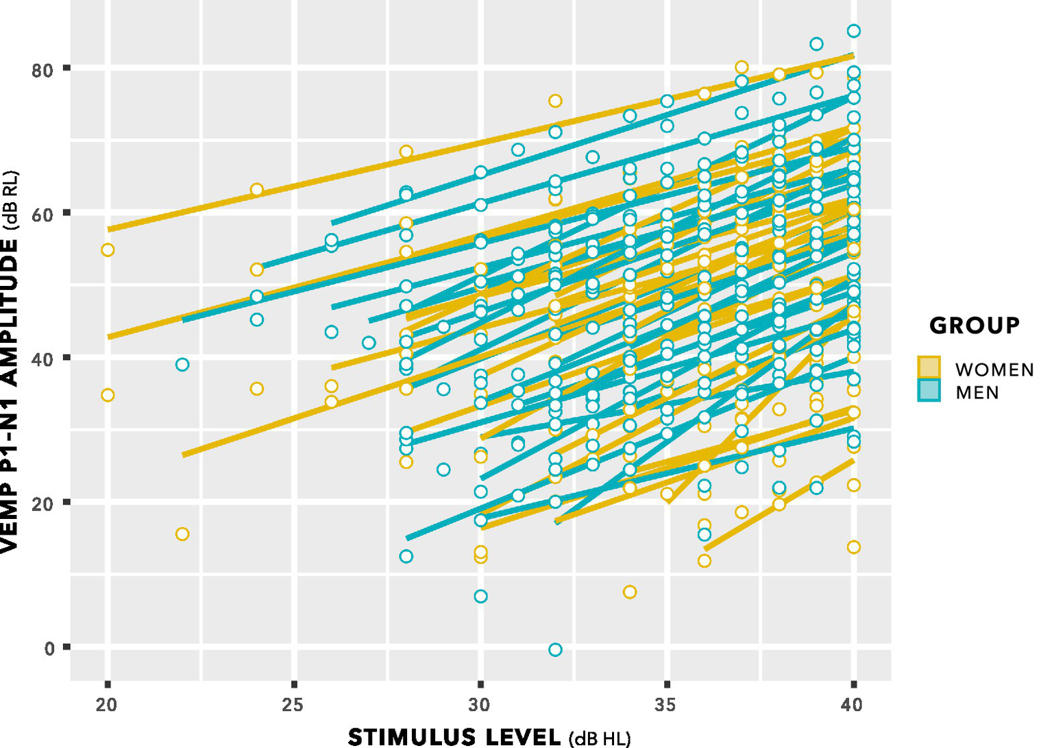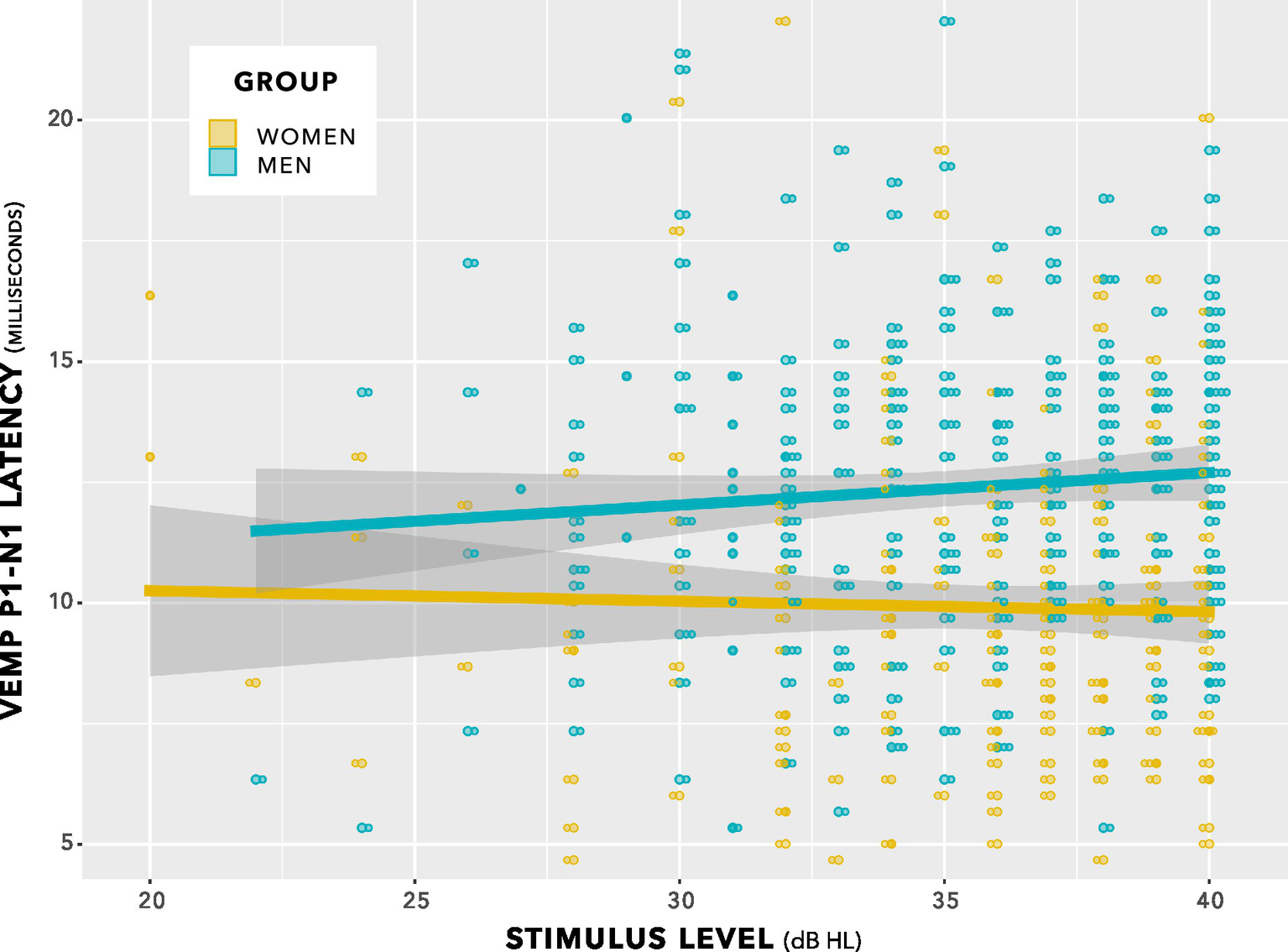 VEMP p1–n1 latencies versus stimulus level for women and men. There was no interaction. Sampling resolution of the Eclipse meant that data points were grouped in steps of 0.33 ms (see note at Figure 5). To provide an indication of when data from both women and men were recorded at the same stimulus level and VEMP p1–n1 latency, data points have been plotted using the beeswarm feature in ggplot (R Core Team, 2020). This feature introduced variation along the abscissa corresponding to the quantity of data present. The variation does not reflect stimulus level used. Stimulus level was always an integer multiple of 1 dB.